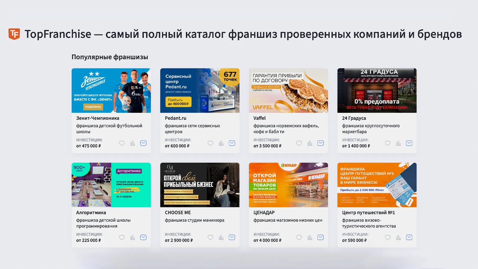 Изучите информацию о франшизе на независимых ресурсах. Такую информацию можно найти, например, на сайтах-агрегаторах TopFranchise, «Франшиза.ру», «Сравни.ру». Они регулярно публикуют данные о работе франшиз, делают рейтинги и обзоры компаний — это позволяет сформировать более полный образ потенциального бизнес-партнёра.