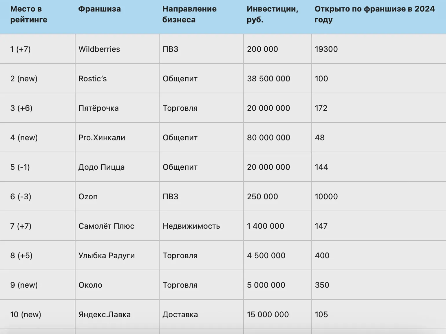 Так, по итогам 2024 года первые 10 мест в рейтинге занимают два маркетплейса (Ozon и Wildberries), представители сферы общепита (Rostic’s, «Pro.Хинкали», «Додо Пицца»), торговли («Пятёрочка», «Улыбка радуги», «Около»), недвижимости («Самолёт Плюс») и доставки («Яндекс Лавка»).