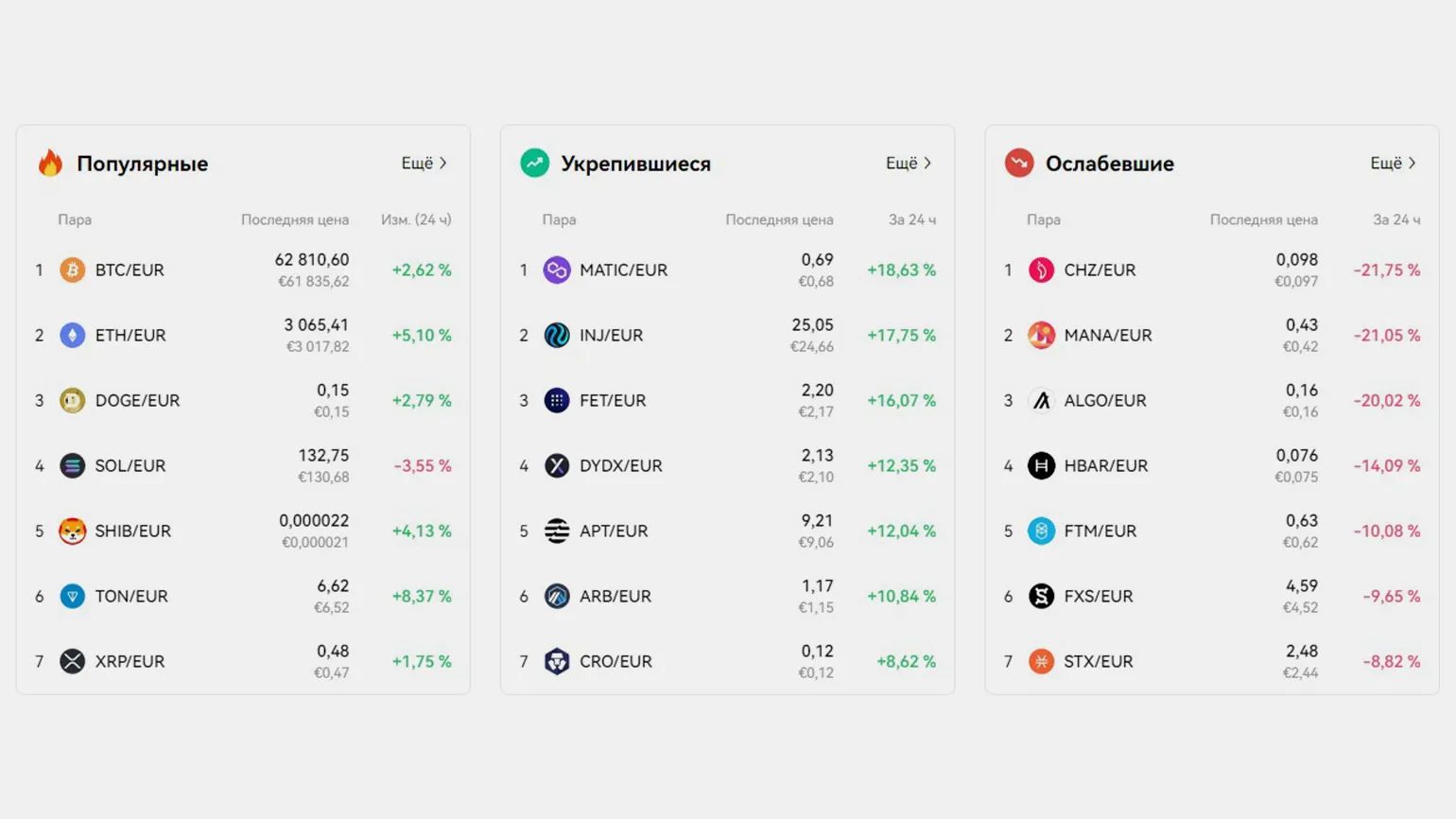 На каких биржах торговать? На биржах с хорошей репутацией и большим объёмом торгов. Это Bybit, OKX, MEXC, HTX, BingX, KuCoin; нерезидентам России также доступна Binance.