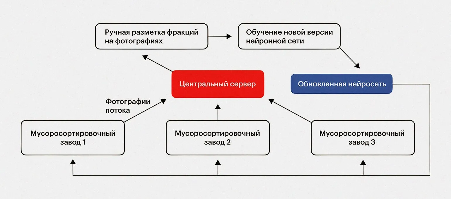 Все мусоросортировочные установки собирают и отправляют на центральный сервер информацию, полученную с датчиков. Люди вручную распознают эти данные и обучают новую версию нейронной сети. Обновлённая нейросеть автоматически доставляется на сортировочные машины. Таким образом, система распознавания непрерывно подстраивается под изменяющуюся морфологию и внешний вид отходов.