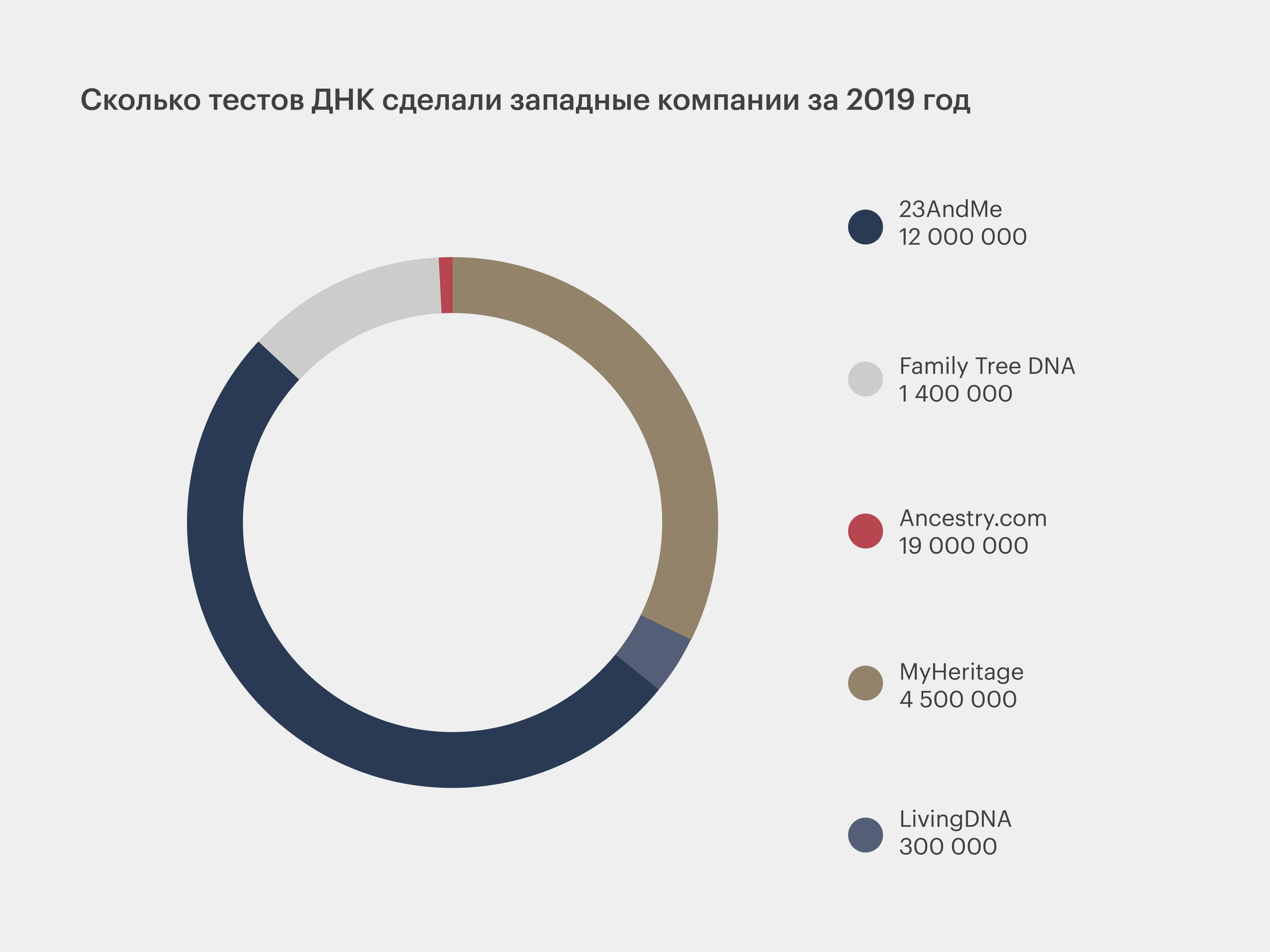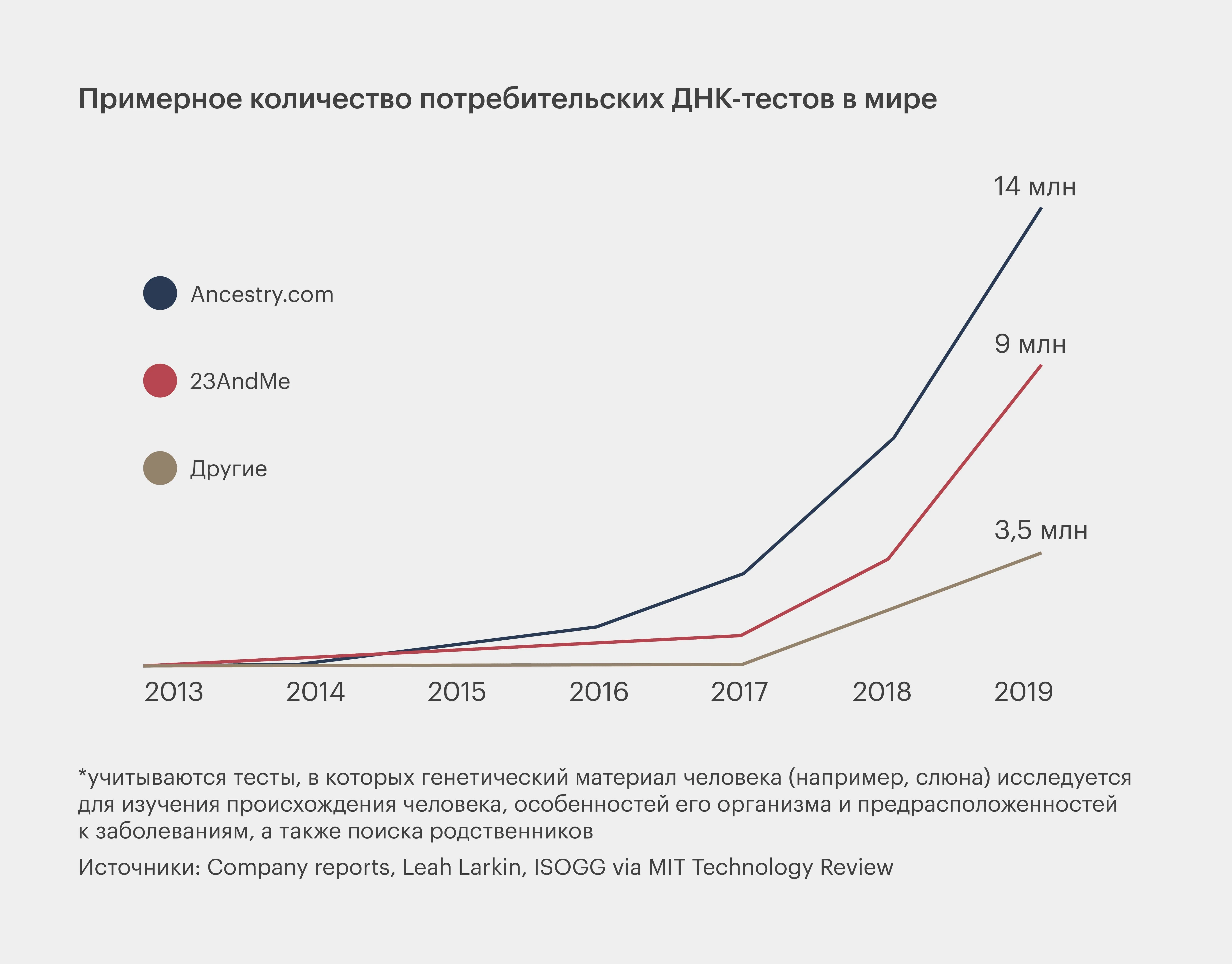 Настоящий бум спроса на тесты на происхождение начался четыре года назад. Если к началу 2017 года общее количество сделанных тестов не доходило до 1,5 млн, то к концу 2018 года оно достигло 26 млн. Львиная доля этого роста пришлась на двух лидеров рынка.