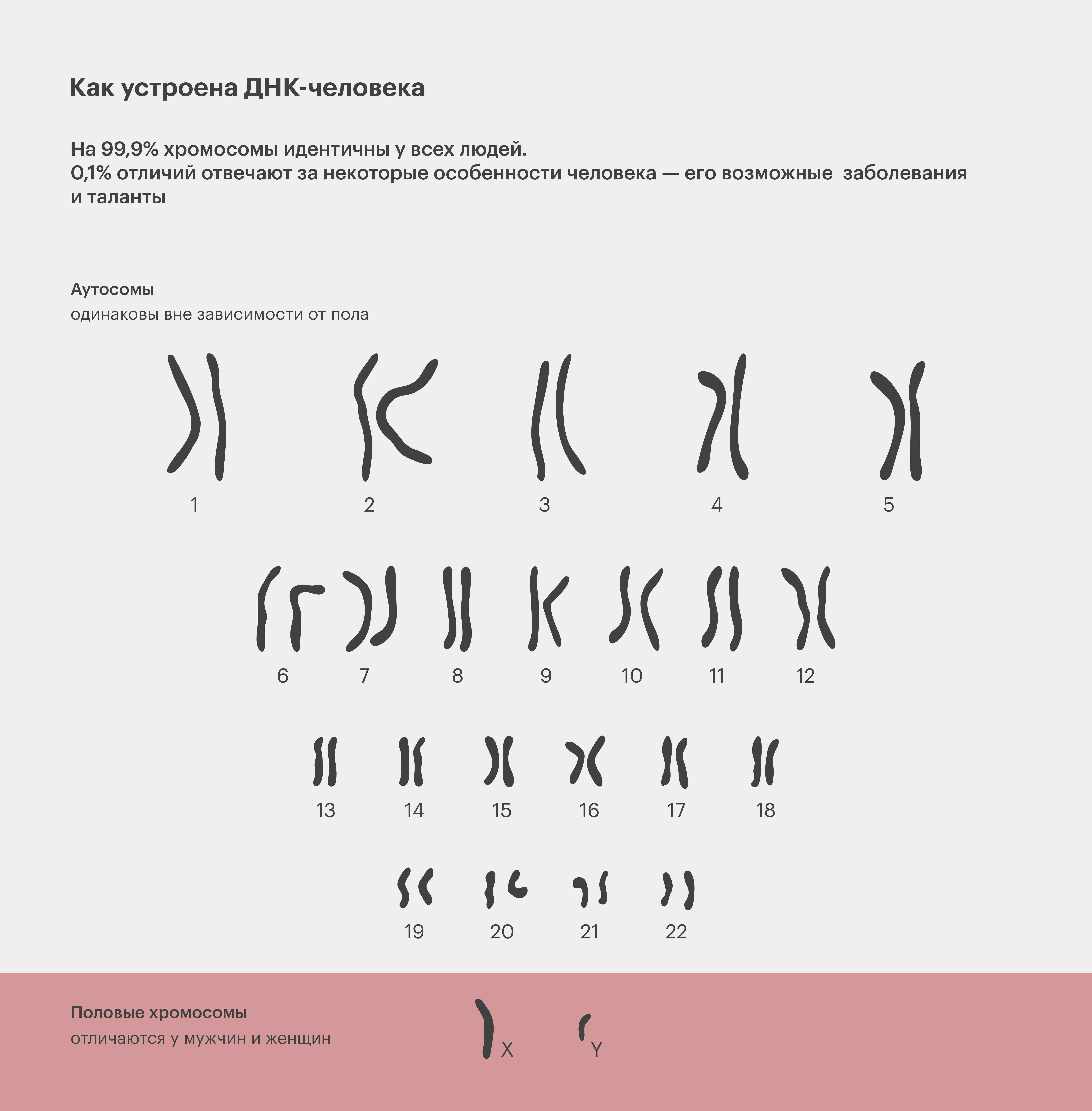 ДНК человека состоит из 23 пар хромосом (некоторые генетические заболевания, например синдром Дауна, изменяют их количество). Одна пара хромосом связана с полом — у женщин это XX, а у мужчин — XY. Остальные 22 пары называют аутосомами — они одинаковы и у мужчин, и у женщин.
