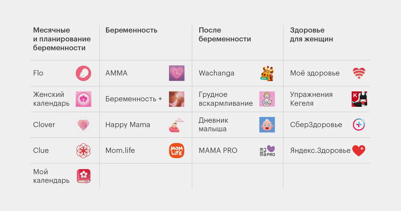 На конец 2019 года FemTech-рынок насчитывал более 3 тысяч приложений, которыми пользовались более миллиона женщин (отчёт Research 2 Guidance). В России же проектов на порядок меньше: в магазинах AppStore и Google Play можно найти около двух десятков сервисов. Перечислим несколько популярных проектов местного FemTech-рынка.