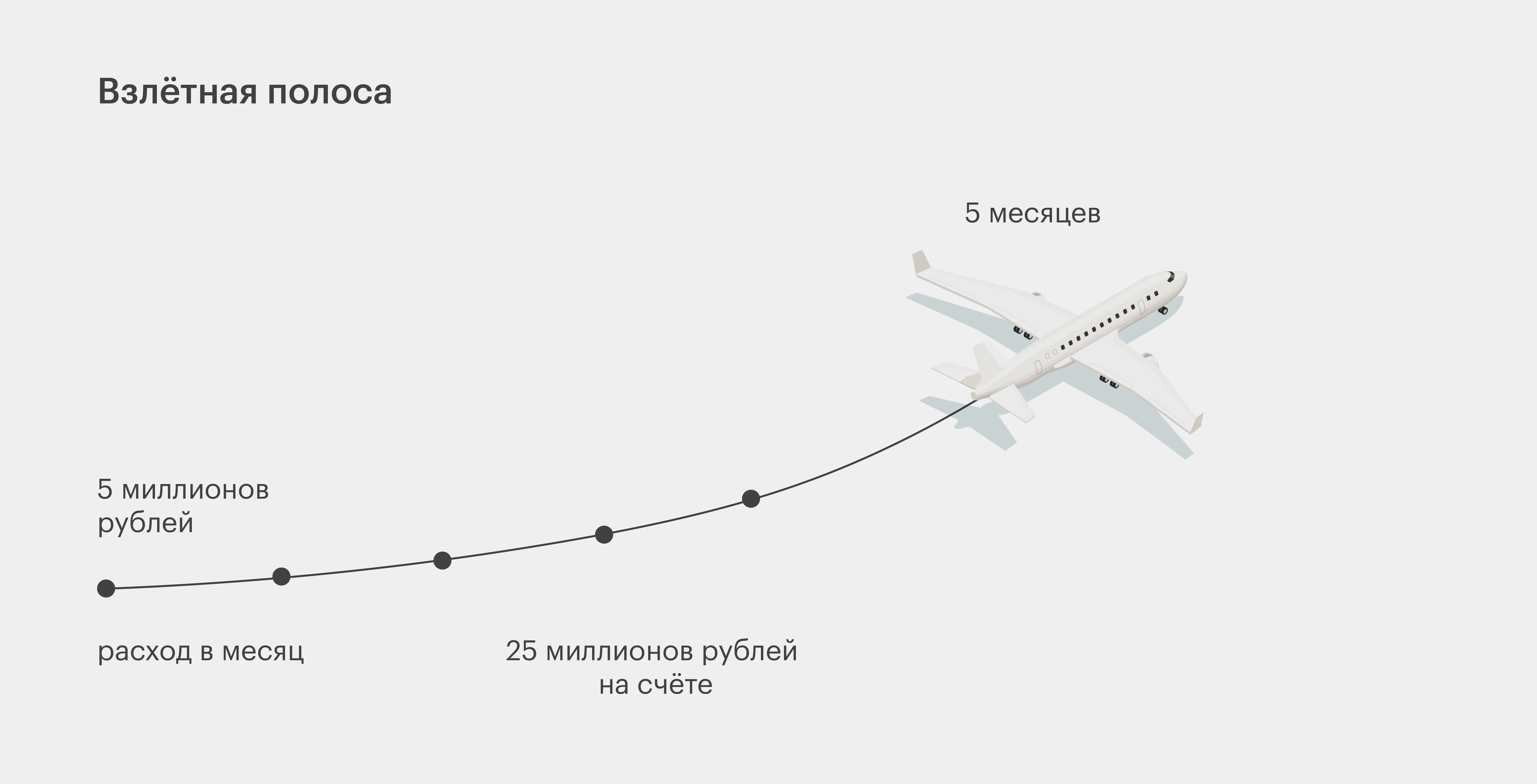 У каждого бизнеса есть так называемая взлётная полоса. Это время, в течение которого бизнес может развиваться по выбранной модели, а может решиться на пивот. Взлётной полосой называют период, на который хватит денежных запасов компании. Чтобы определить длину «взлётной полосы», все денежные запасы делят на месячные расходы.