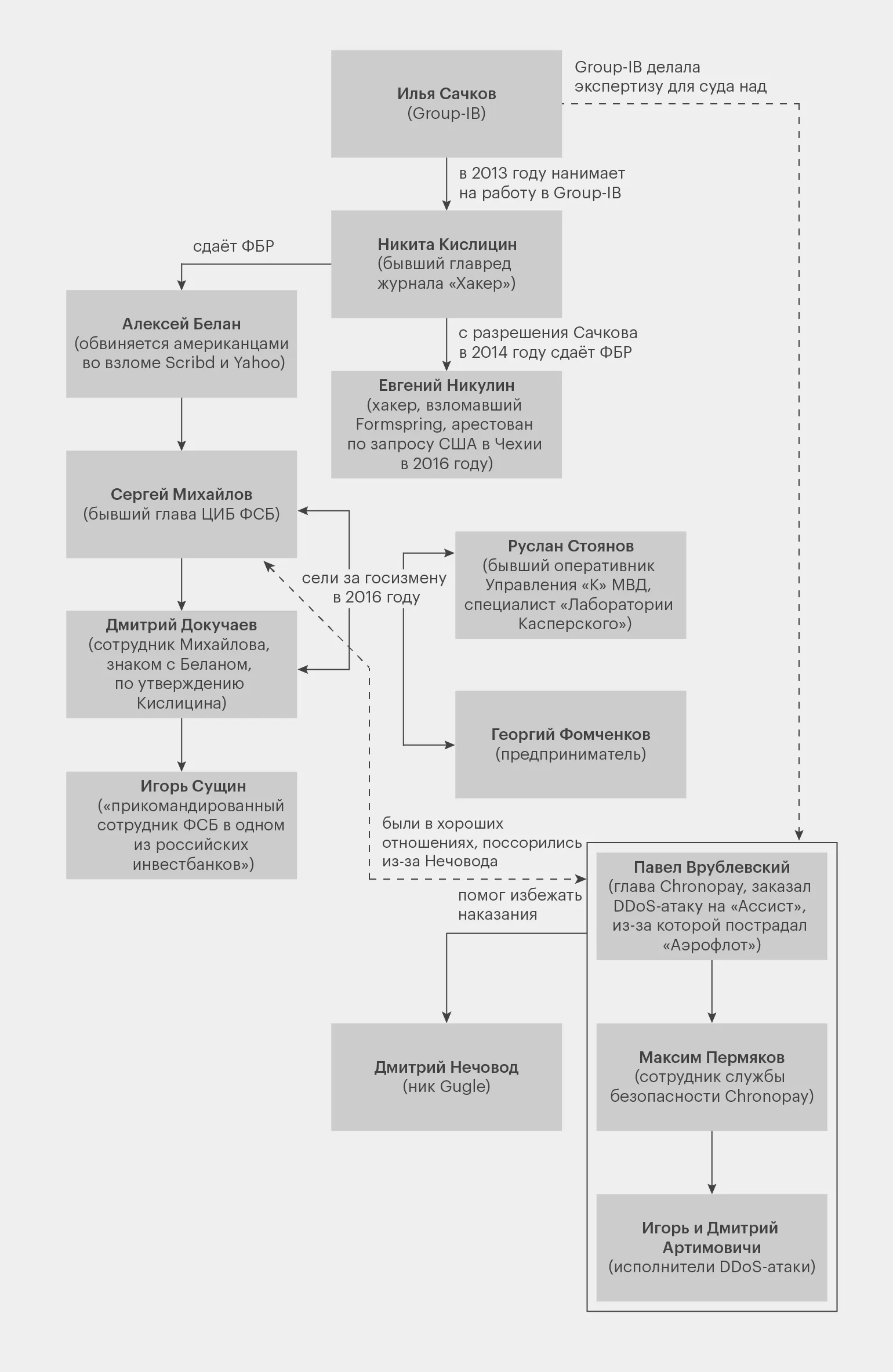 «США несколько лет назад стали пачками хватать русских хакеров по всему миру. Наши органы поняли, что кто-то льёт американцам инфу. Заподозрили в этом сначала одну группу лиц, арестовали её в 2016 году и успокоились. Но в прошлом году американцы, перед тем как начать слушания по Никулину в суде, рассекретили показания Кислицина от 2014 года. В конце допроса он пообещал ФБР передать данные о юзерах кардерского форума feteam. Всё это, по его словам, тоже было санкционировано Ильёй Сачковым», — подвела итог бывшая журналистка Мария Коломыченко, специализирующаяся на освещении этой тематики.