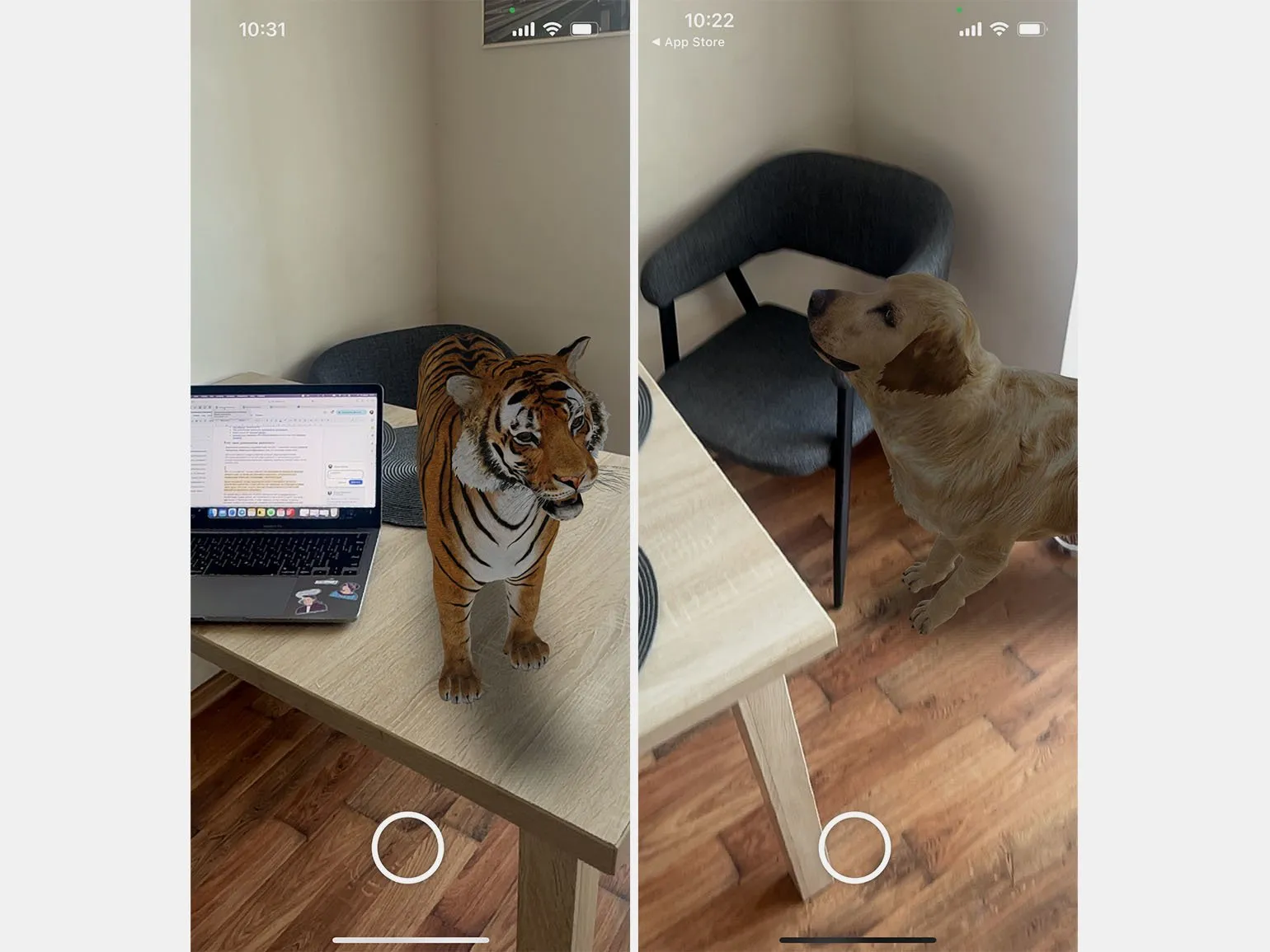 Вот как это работает. Камера устройства фиксирует кадр из реального мира, а программа AR добавляет к ней виртуальные объекты. В результате человек видит на экране устройства реальность с изменениями. Например, тигра на своём столе или собаку под столом.