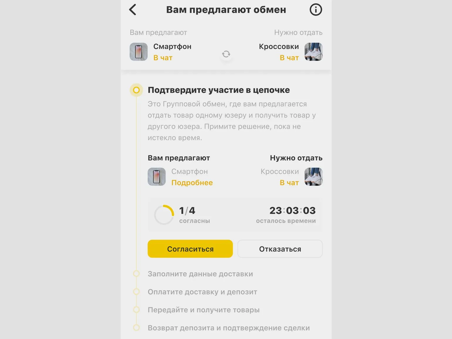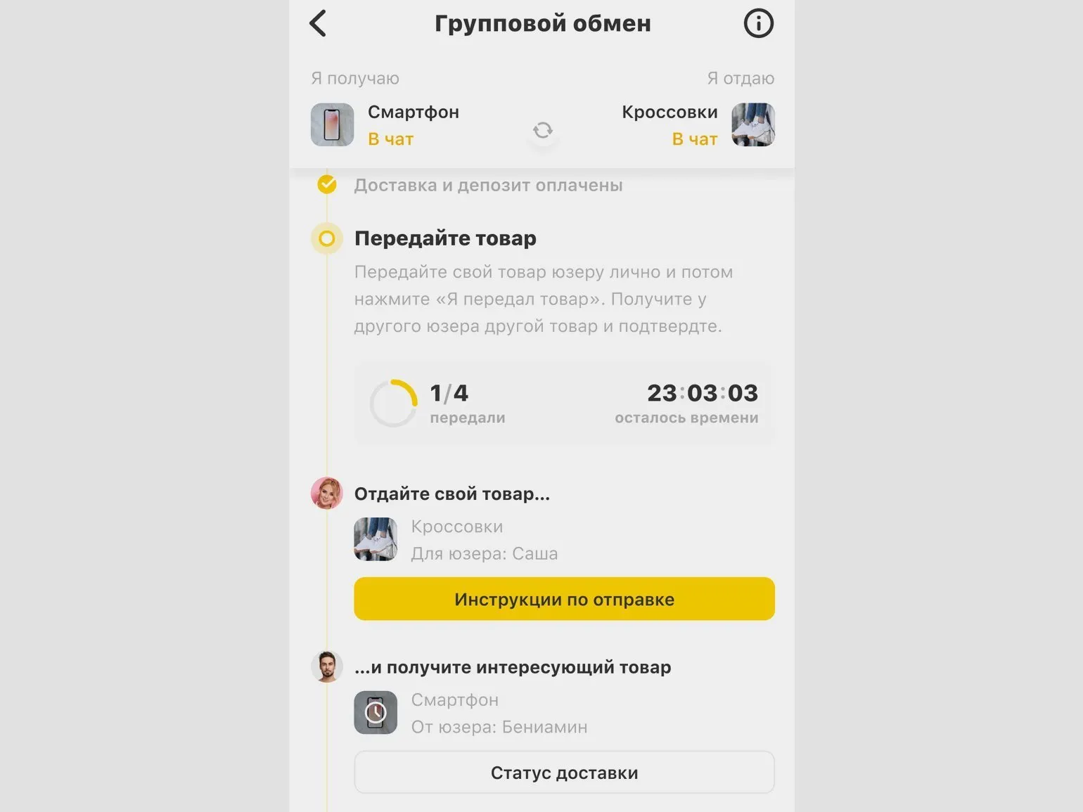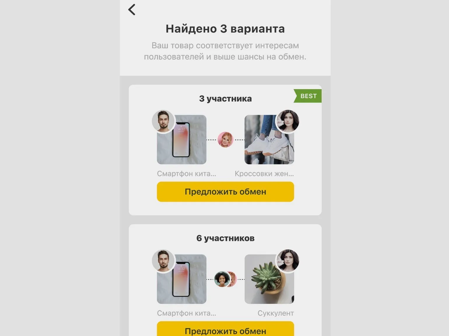 Ещё один способ обойти эту сложность — групповые обмены. В них участвуют более двух человек. Потребность в них также возникает в случаях, когда пользователю нужен предмет стоимостью намного больше, чем вещь, которую он готов предложить взамен. Алгоритм Swop.it позволяет провернуть подобные сделки за несколько минут и выстраивает оптимальную цепочку обменов.