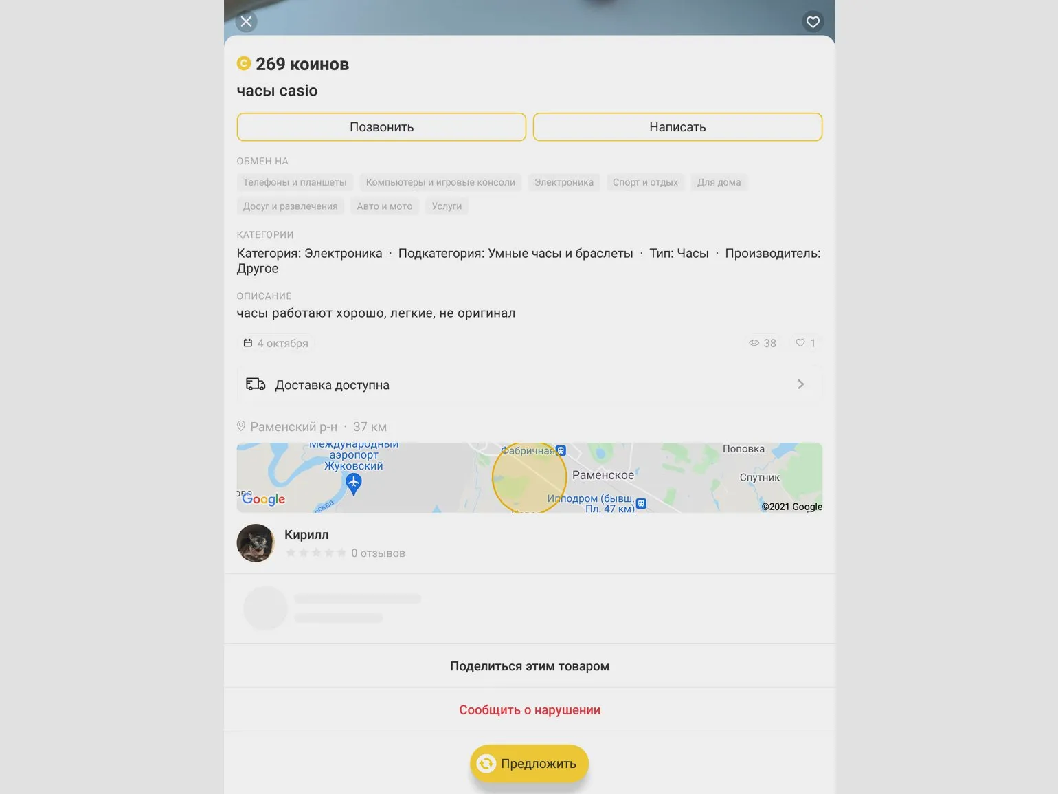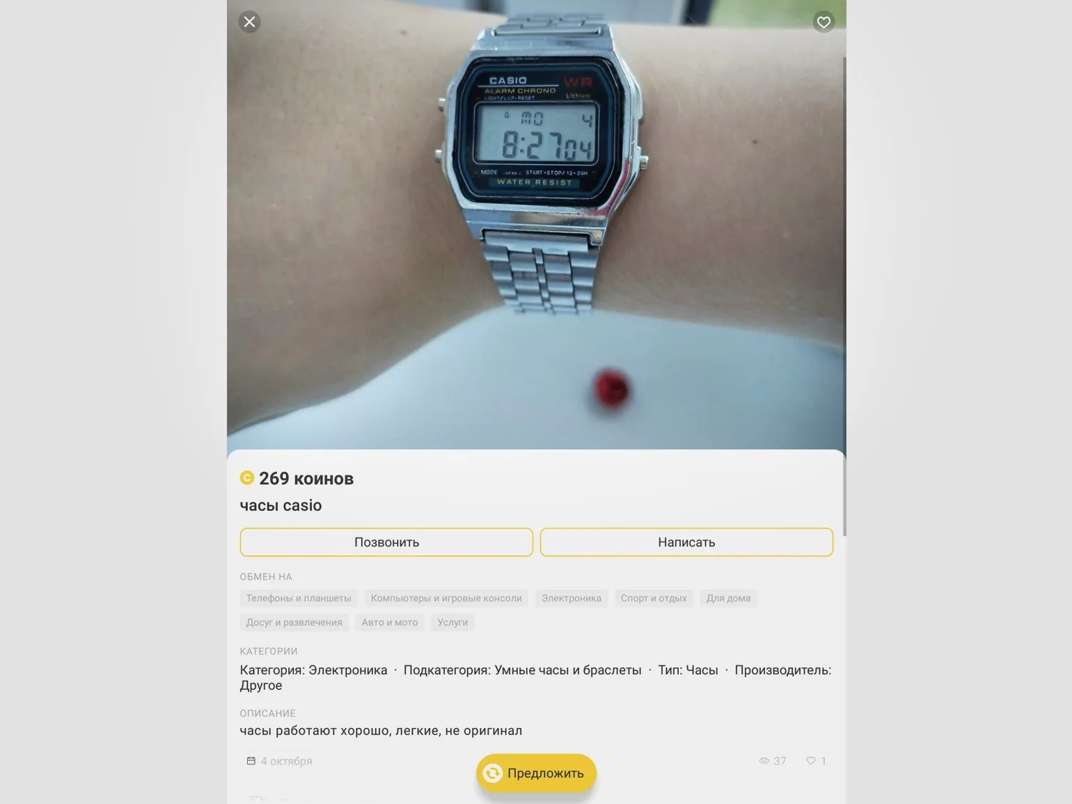 Чтобы добавить свою вещь в систему, достаточно разместить пост с фото. Перед публикацией сервис попросит написать стоимость предмета в коинах, а также выбрать категории товаров, интересующие пользователя. Затем алгоритм подберёт несколько вещей из указанных разделов и предложит совершить сделку.