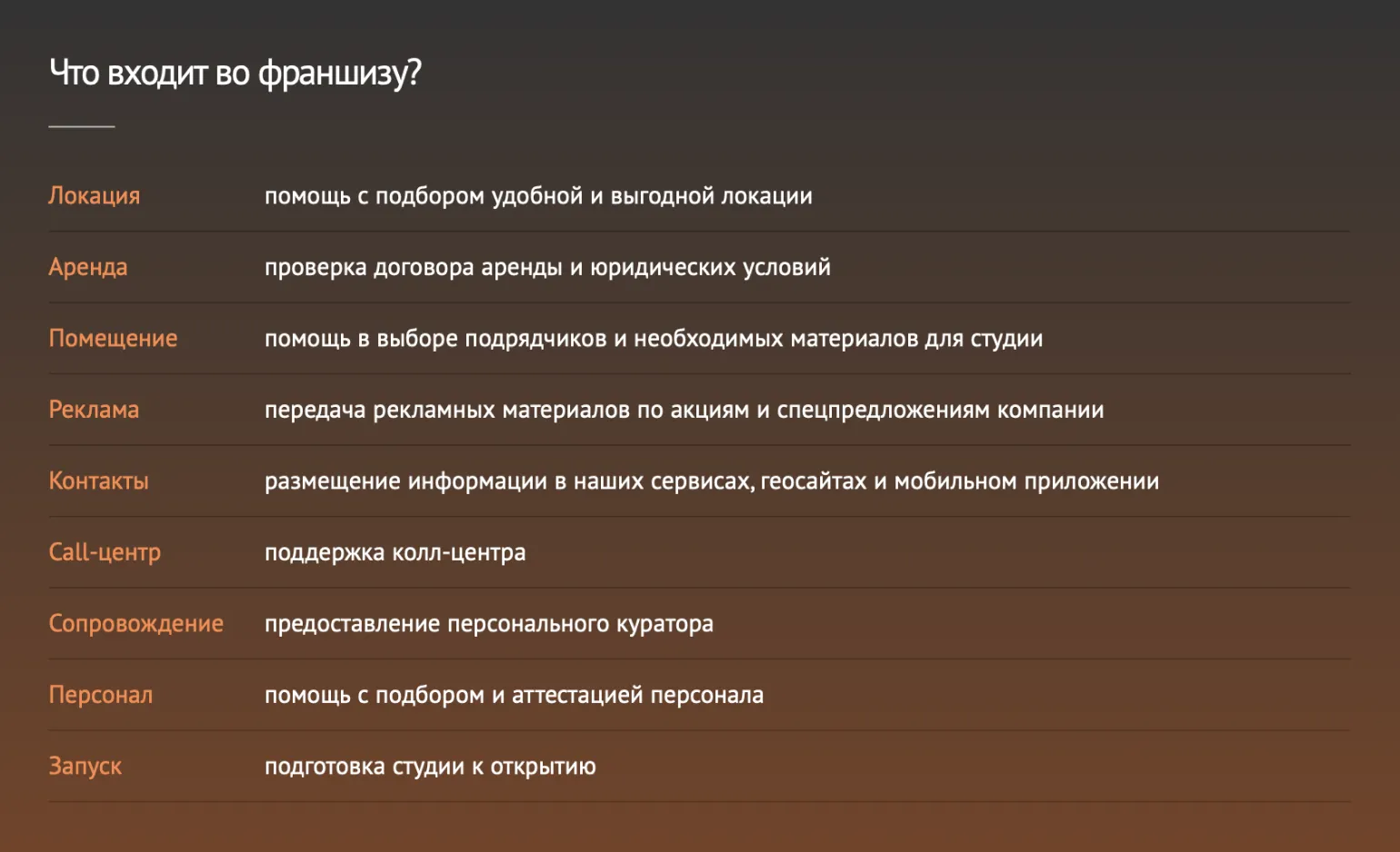 Степень поддержки. Нужно внимательно изучить, какие услуги франчайзера входят в сопровождение. Чем больше услуг, тем продуманнее бизнес-модель и тем меньше рисков для франчайзи.