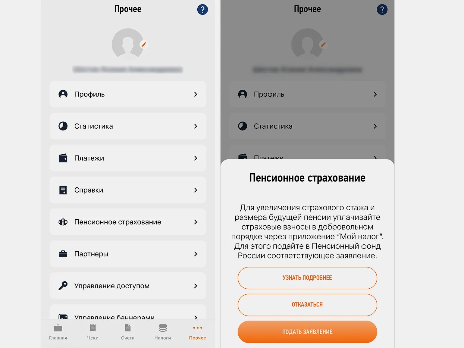 Зайдите в приложение «Мой налог», нажмите «Прочее» → «Пенсионное страхование» → «Подать заявление».