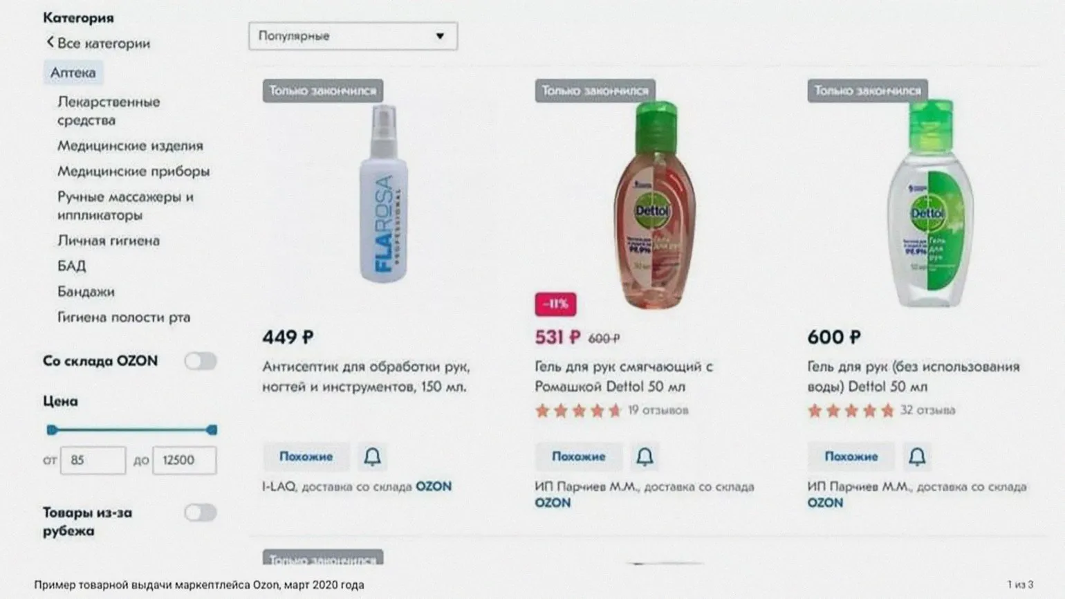 «Их продавали литрами, комплектами и даже канистрами. И вдруг все научились делать средства защиты, а на каком оборудовании — вопрос интересный, — комментирует Драпеза. — На маркетплейсах появились десятки новых брендов-производителей, а средства гигиены можно было купить даже на „Авито“».