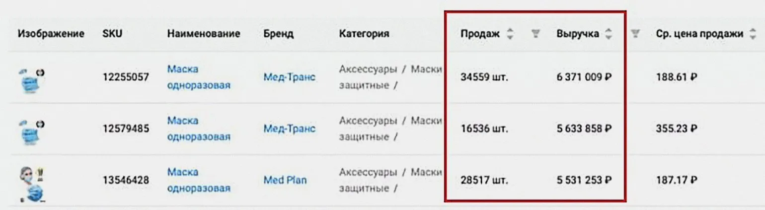 В сентябре прошлого года месячная выручка лидеров в категории «Маски защитные» на Wildberries находилась в районе 6 млн рублей. В топах продаж — комплекты одноразовых масок.