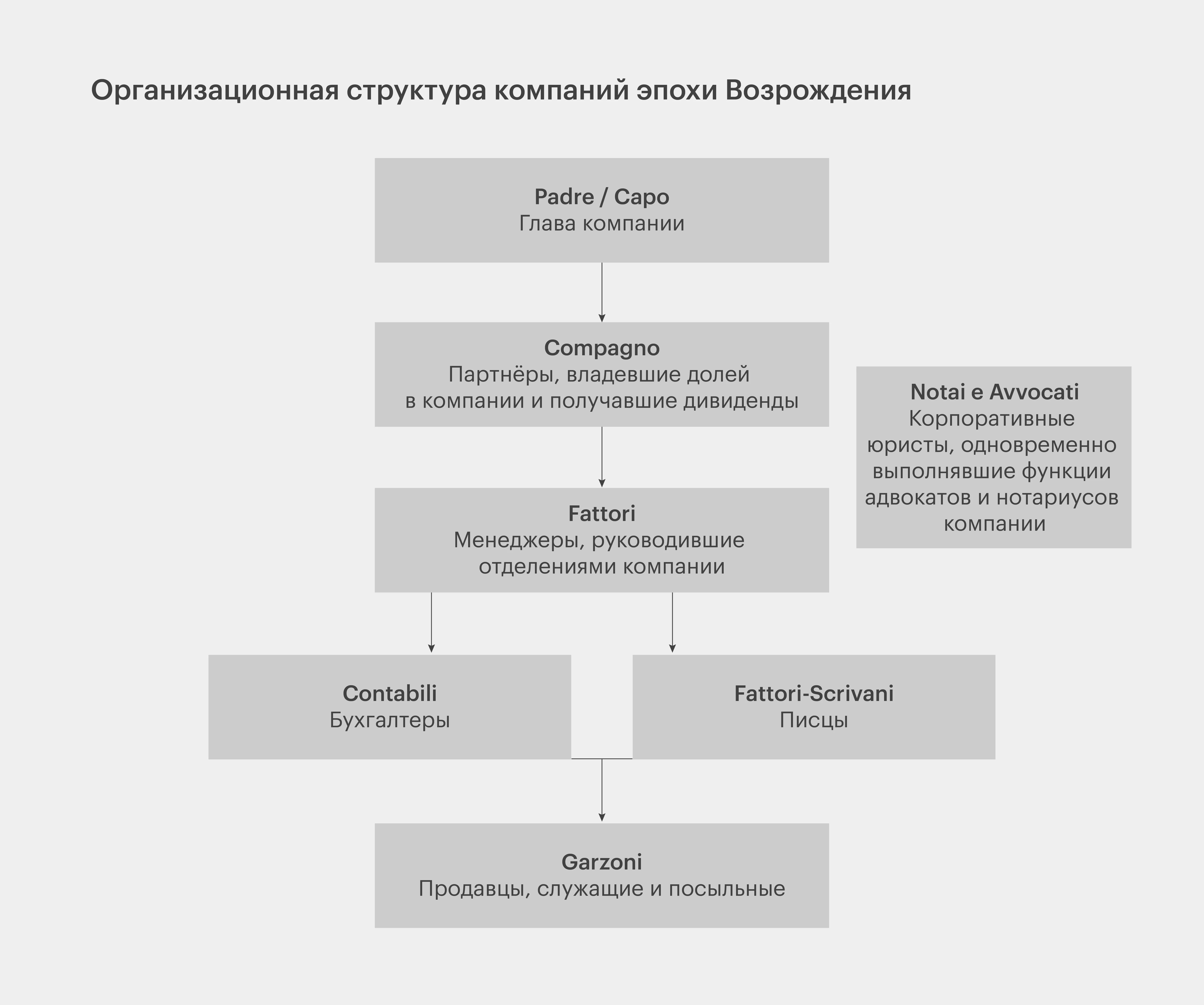 Верхушкой иерархии наёмных работников были fattori — менеджеры, которые руководили отделениями компании. По сути, они делали всё то же самое, что и партнёры, но при этом не владели долей в бизнесе и получали фиксированную зарплату. Некоторые fattori, накопившие денег, порой и сами становились партнёрами в компаниях.