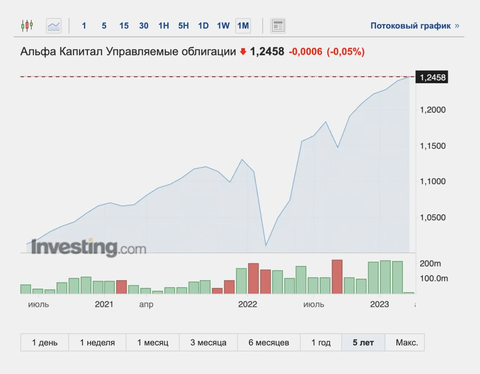 Например, БПИФ «Альфа-Капитал Управляемые Облигации» с июня 2020 года по февраль 2023 вырос на 22,76%. Те, кто вложил в него тогда 300 000 рублей, могут продать паи сейчас и получить прибыль в 68 280 рублей.