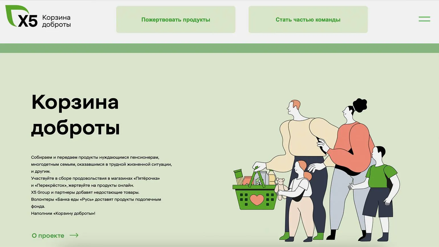 Так, сети супермаркетов «Пятёрочка» и «Перекрёсток» реализуют проект «Корзина доброты» для пенсионеров, многодетных семей и других групп людей, находящихся в тяжёлой жизненной ситуации.