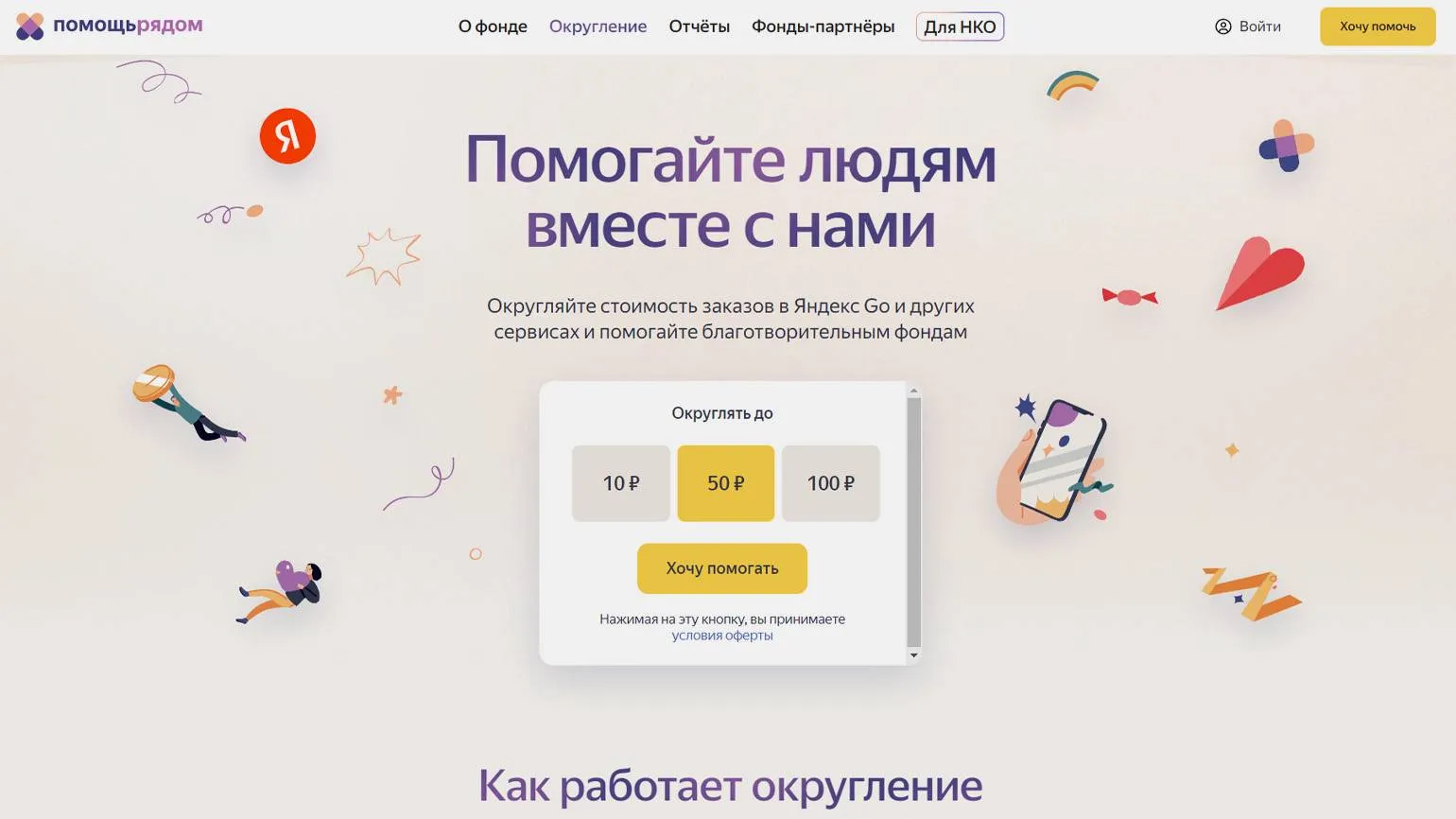 Так, благодаря тому, что «Яндекс» активно рассказывает о своём благотворительном проекте «Помощь рядом», более 1 миллиона пользователей округляют свои заказы в сервисах «Яндекса», а сумма округления уходит фондам. Также компания сотрудничает с фондами-партнёрами напрямую: на официальном сайте указаны названия 594 организаций, которым помогает «Яндекс».
