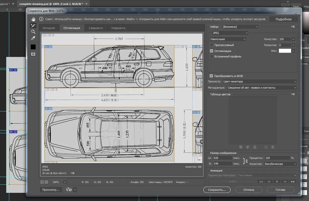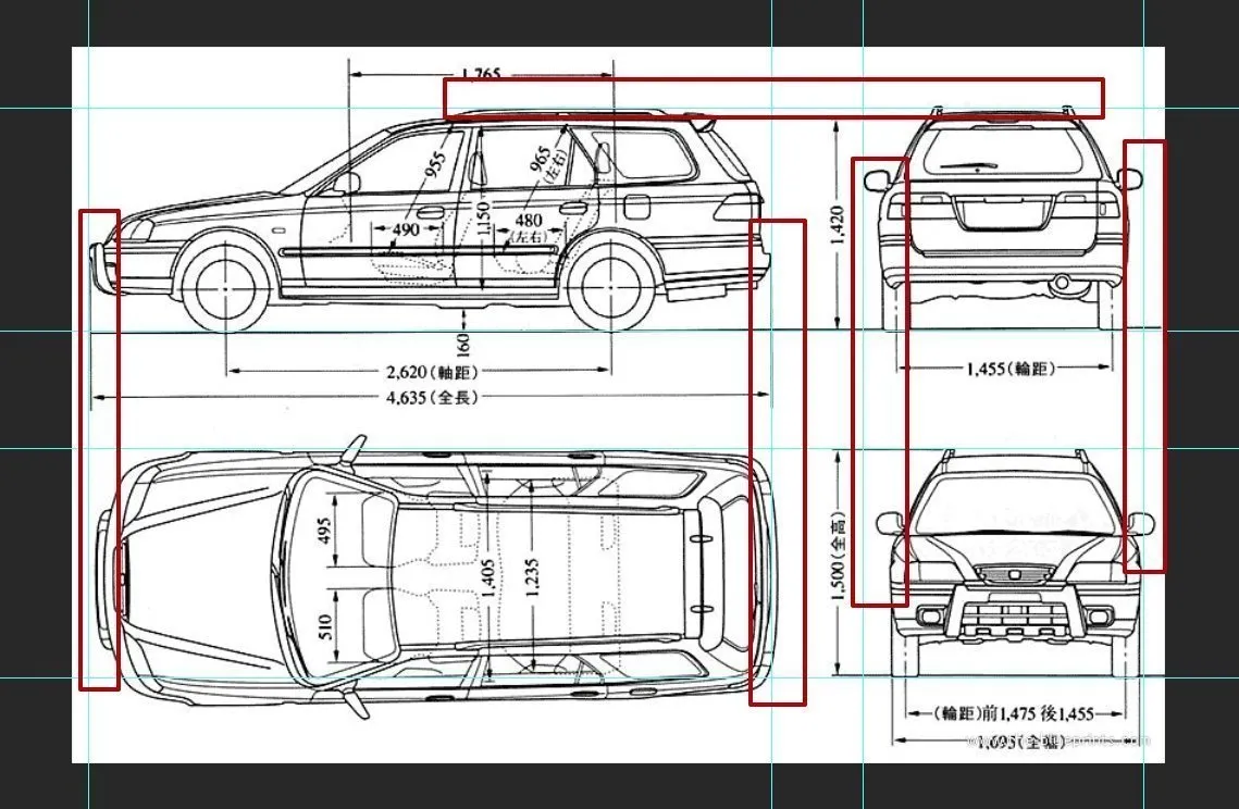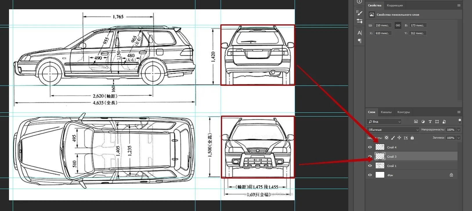 Перед тем как перейти непосредственно в 3ds Max, давайте используем Photoshop, чтобы подготовить чертёж. Смысл подготовки чертежей в том, чтобы проверить пропорции автомобиля и соответствие основных габаритов между всеми проекциями.