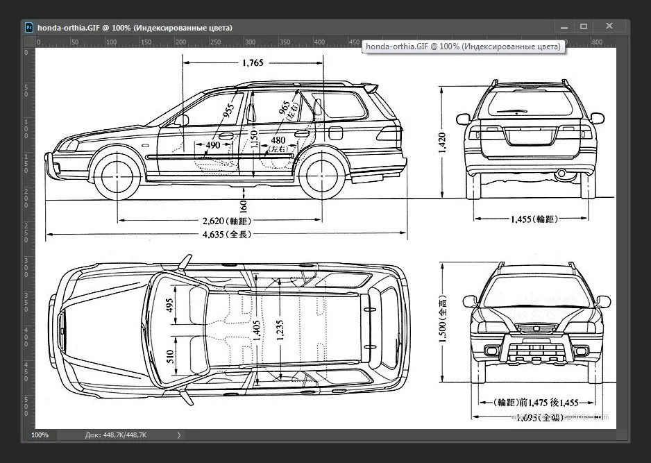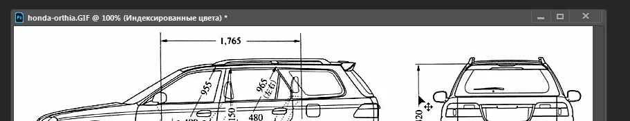 Чертежи для Хонды оказались такими же редкими, как и сама машина. Мне пришлось использовать общий чертёж с разрешением 820×549 на 72 dpi. Плюсы этого чертежа в том, что в нём указаны габариты и основные элементы кузова; детали можно будет потом уточнить по референсам. Существенный недостаток — маленькое разрешение картинки.