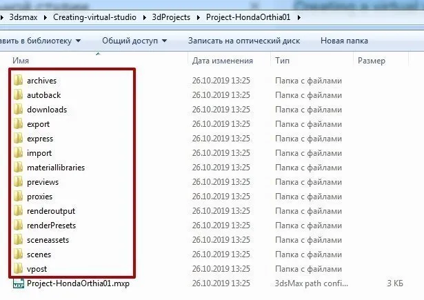 После создания проекта перейдите в папку этого проекта (в моём случае — Project-HondaOrthia01) и посмотрите, какую структуру предлагает нам 3ds Max из коробки.