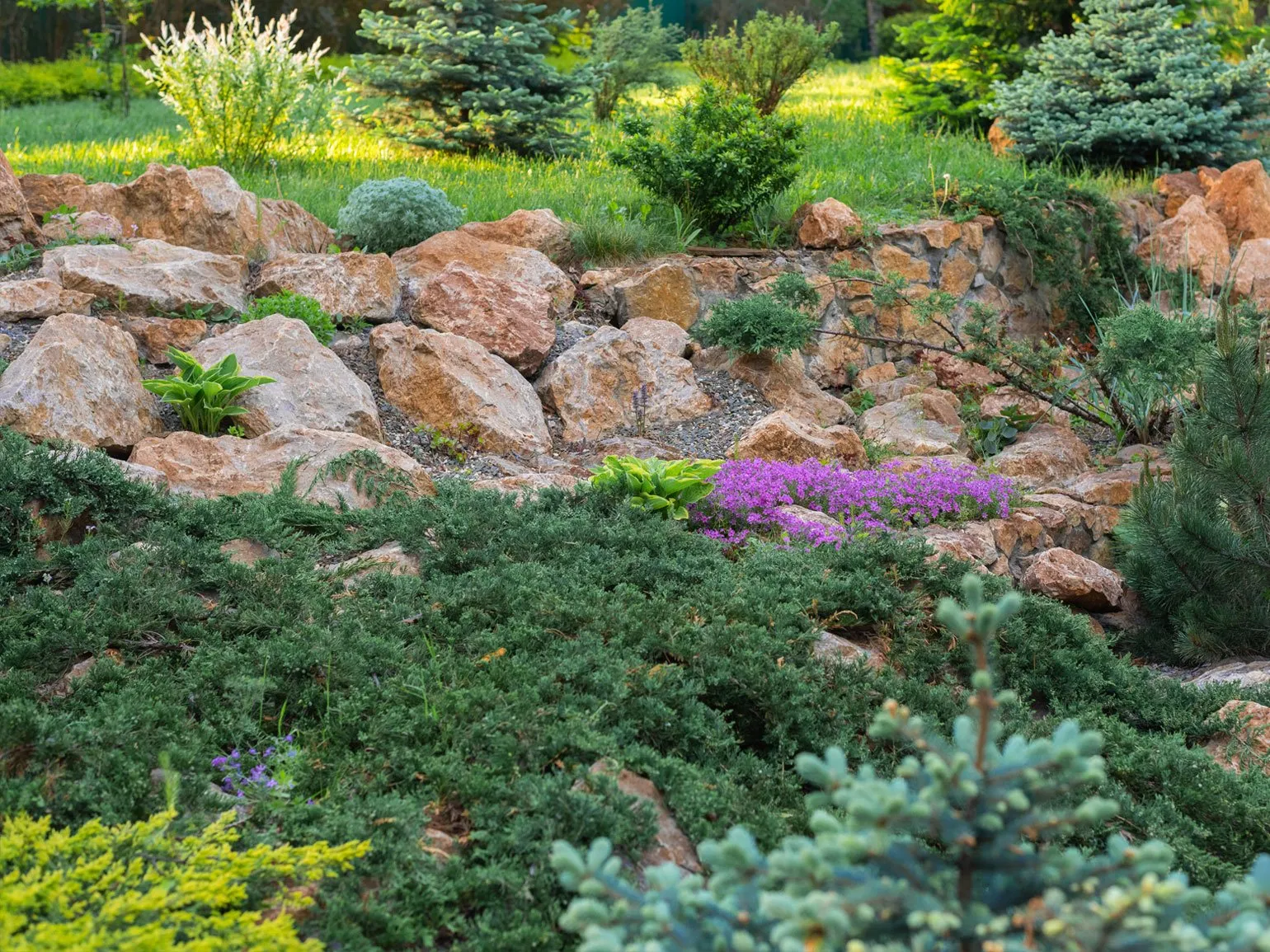 Альпийские горки могут быть стилизованы под разные природные локации, и для каждой дизайнер будет подбирать специальные материалы ― горные породы и растения.