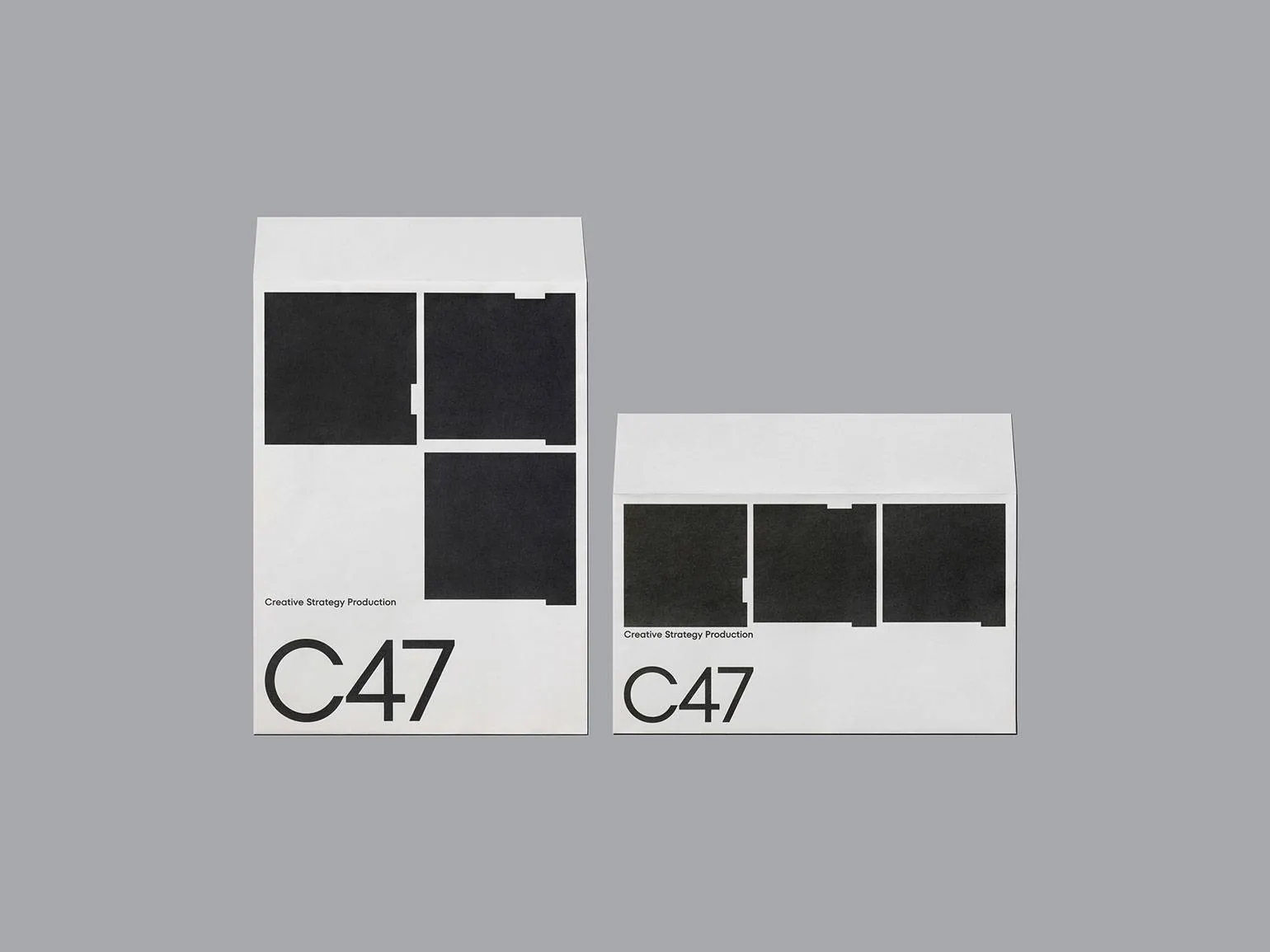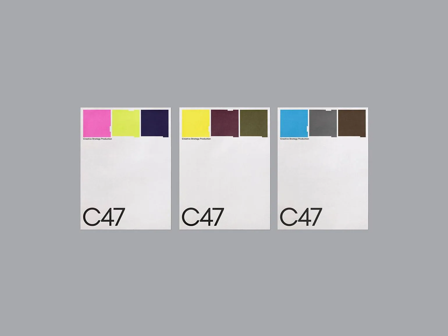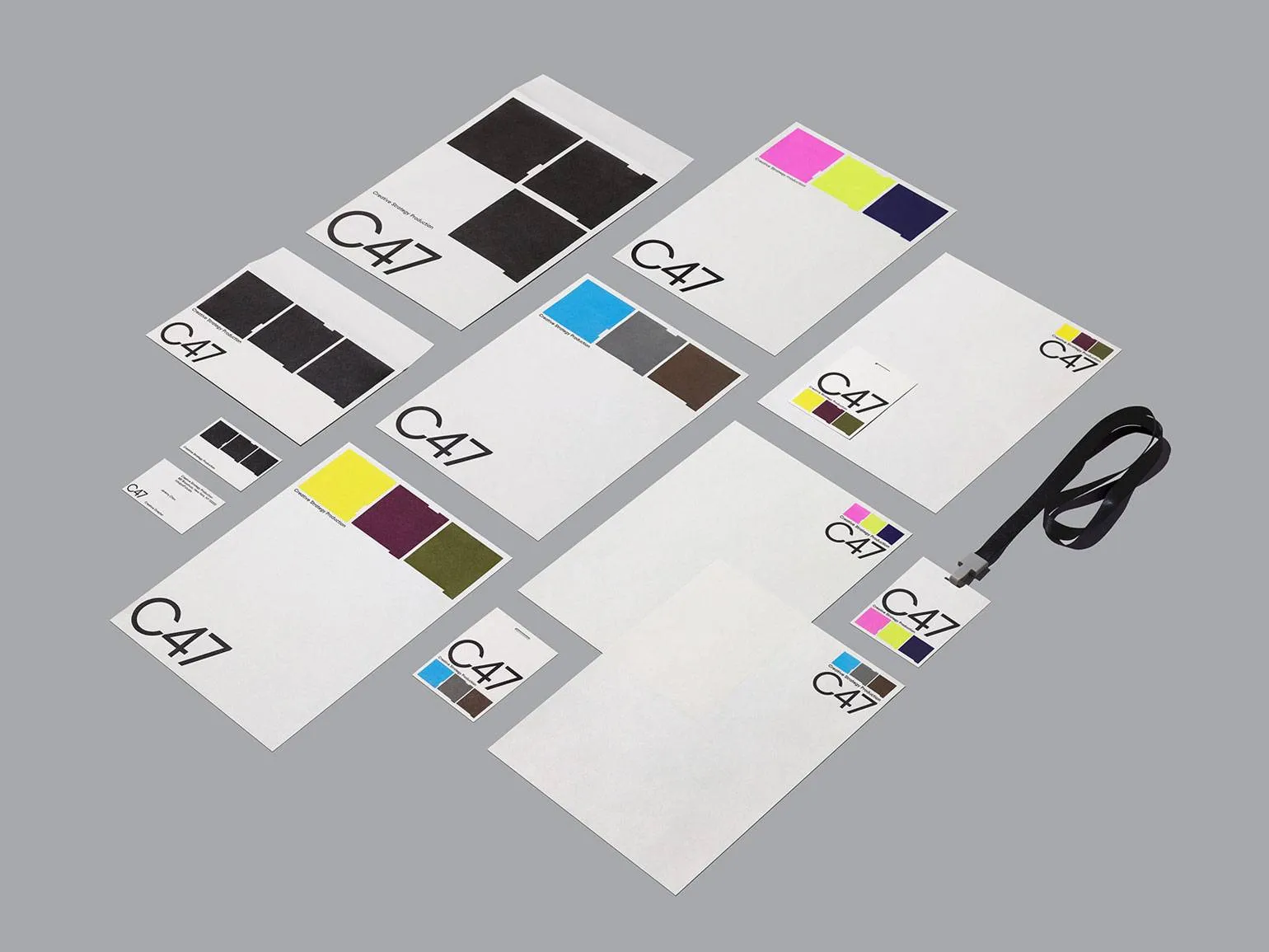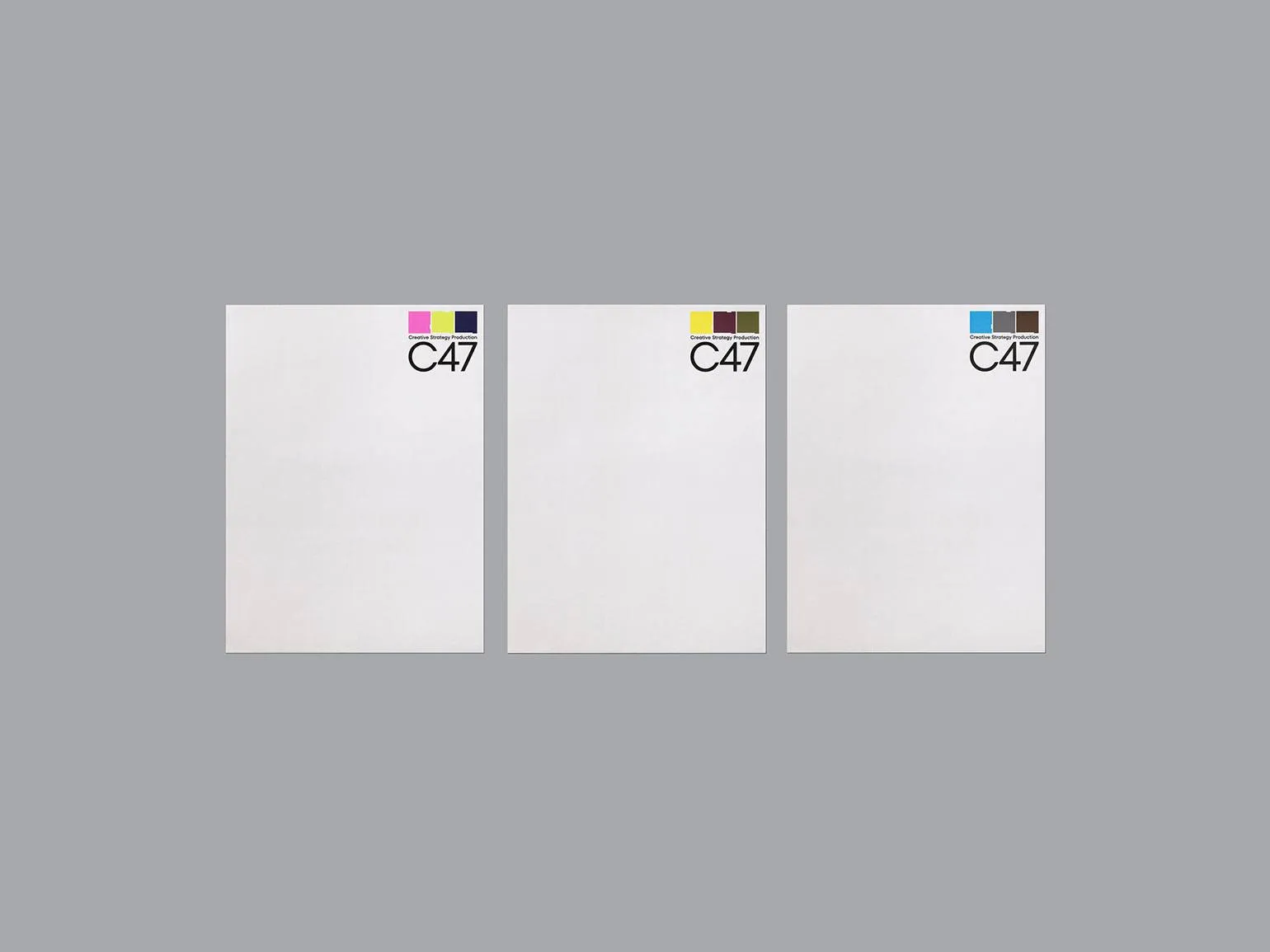 В новой работе для креативной компании C47 дизайнер использует простое решение: он оформляет деловые бумаги и офисные принадлежности бренда с помощью цветных квадратов с дефектами. Благодаря этому C47 не ассоциируется с типичной корпоративной скукой.
