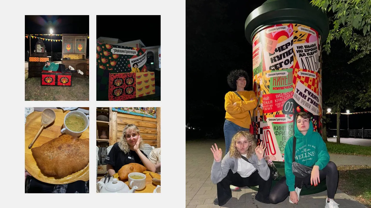 Второй раз мы поехали в Кинешму в ночь перед началом фестиваля. Прибыли и сразу отправились на бульвар, чтобы посмотреть на носители. Ради этого момента дизайнер и существует. По бульвару были расставлены фотозоны, сундуки и, конечно же, огромные афишные тумбы, которые захотелось обнять. Мы радостно носились по бульвару, фотографировались, не замечая холода ночи.