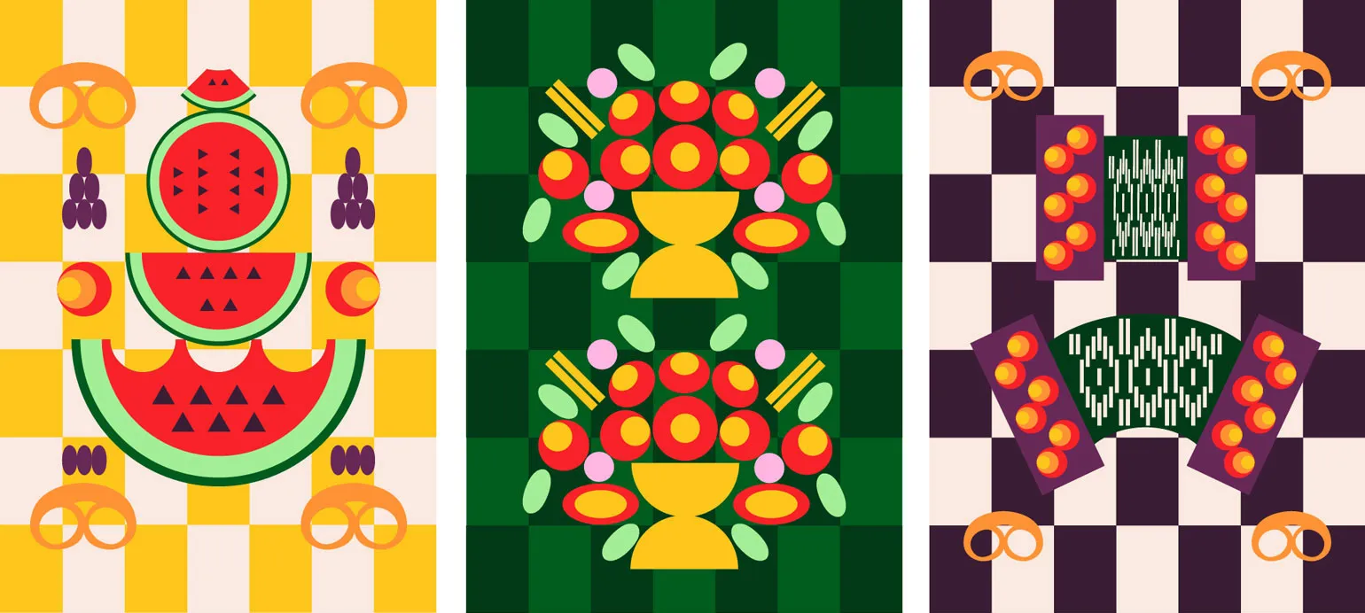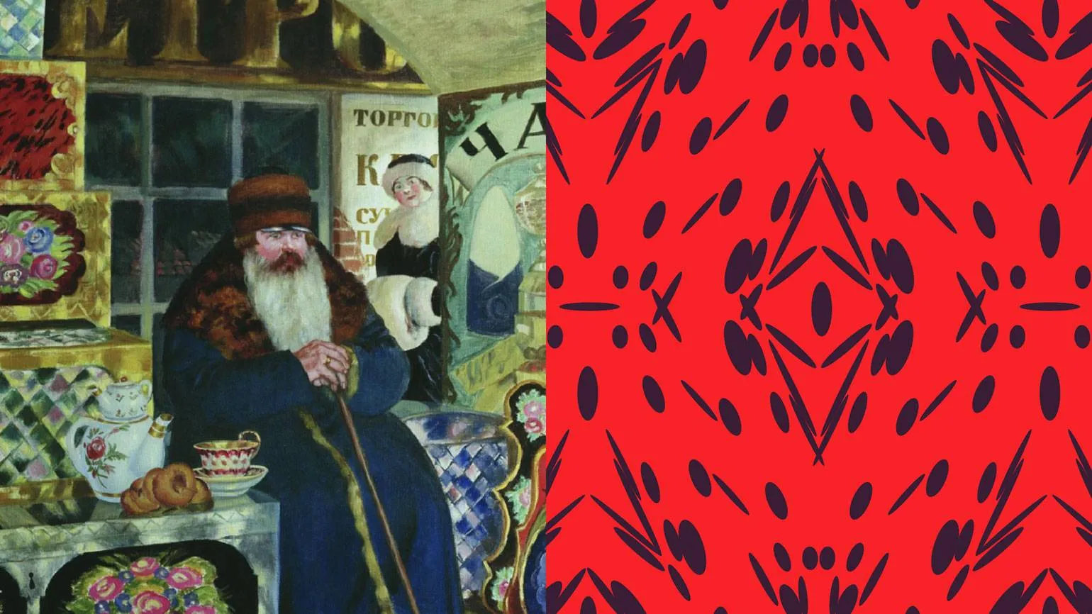 Леопард попал в графику и с работ Кустодиева. На картинах «Купец-сундучник» и «Сундучник» изображены сундуки с узорами, похожими на леопардовую раскраску, да ещё и в необычном красном цвете, который сейчас актуален. Я взяла ритм и форму пятен с картины и переработала в большой паттерн. Если абстрагироваться, то в нём можно увидеть и колоски зерновых культур, и семечки арбуза.