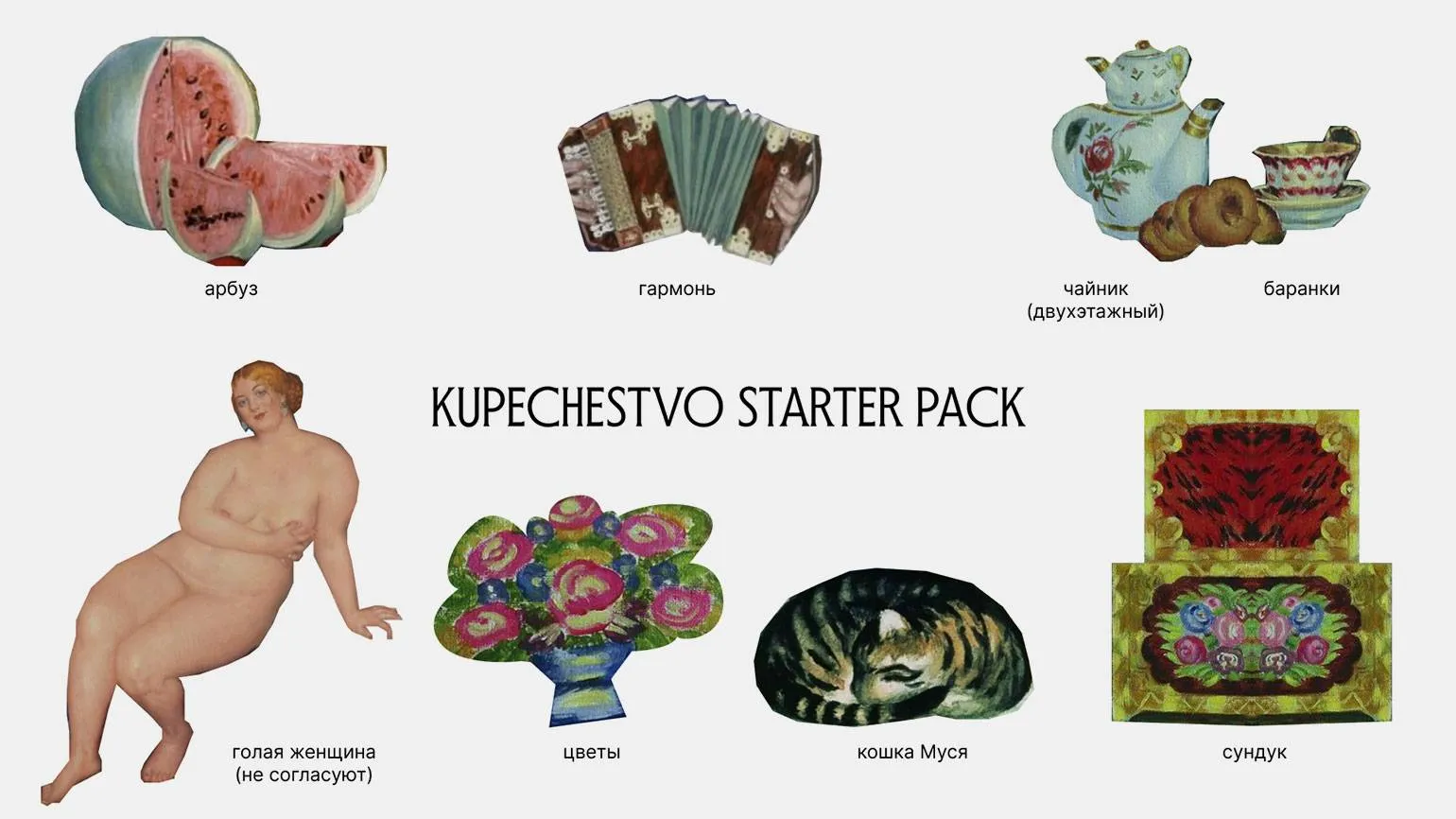 Собрала из них Kupechestvo Starter Pack. Стартер-пак — термин-мем — подборка предметов для того, чтобы что-нибудь начать. В него вошли: арбуз, баранки, двухэтажный чайник, самовар, кошка и голая женщина. Последняя не прошла кастинг, поэтому на одной из картин с красоткой были использованы цветы для создания паттерна — наша пасхалка.