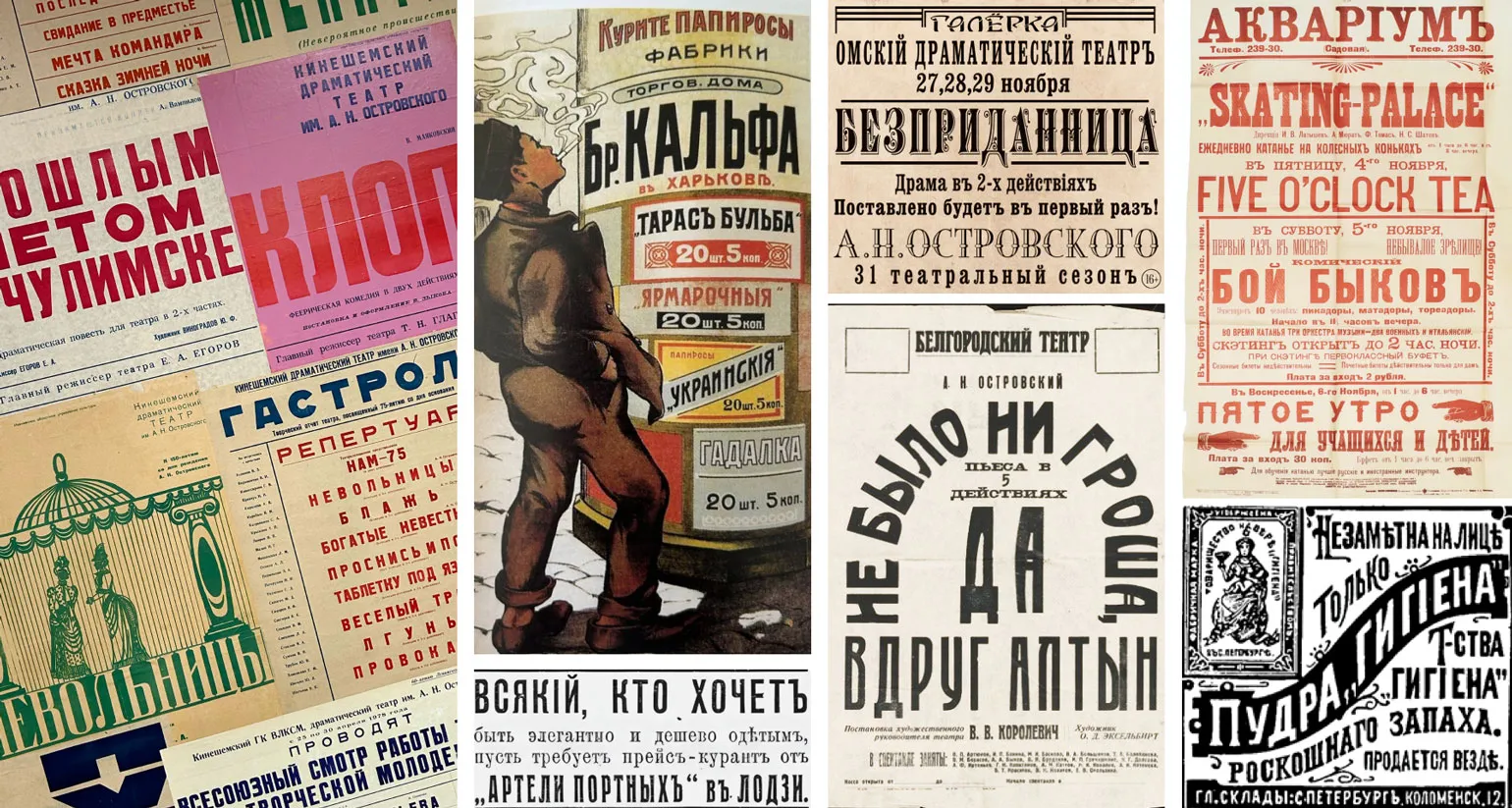 Логотип мероприятия собрался из реально существовавших букв — их мы нашли в афишах музея театра и в книге Элеоноры Глинтерник «Реклама в России XVIII — первой половины XX века».
