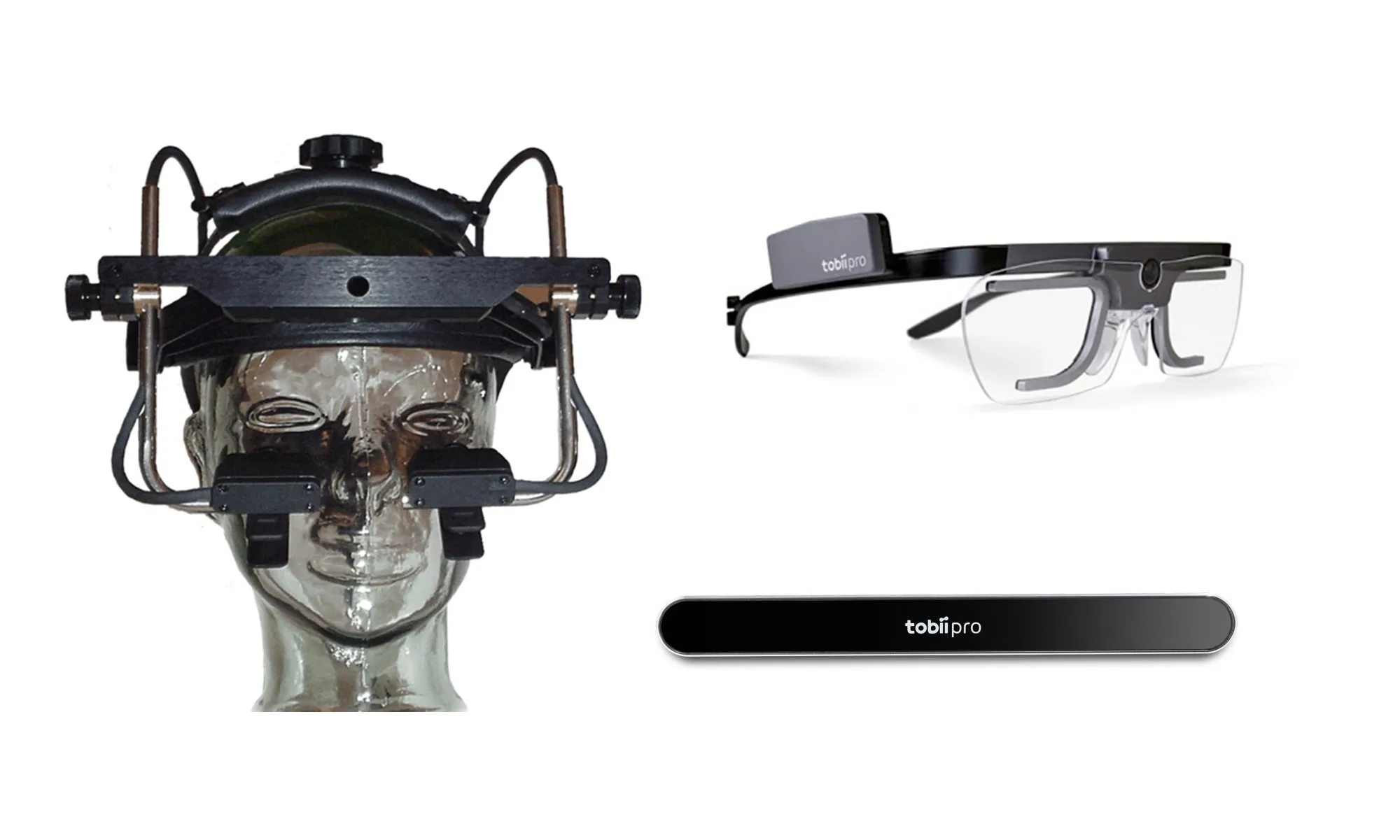 Вот. Слева — фрагмент стационарного айтрекера, который фиксируется на голове. Справа — компактные модели: сверху очки, а снизу прибор, который надевают на экран.