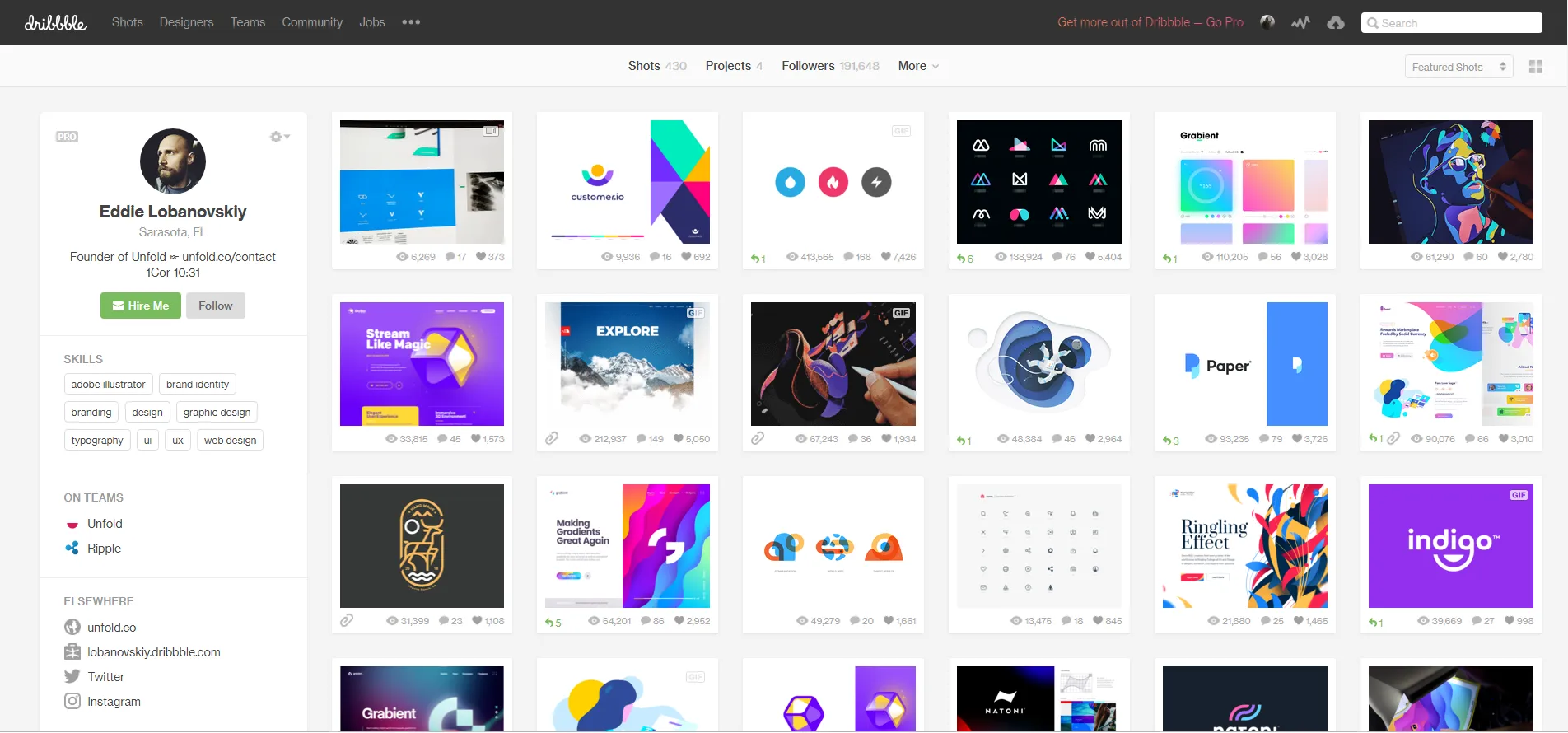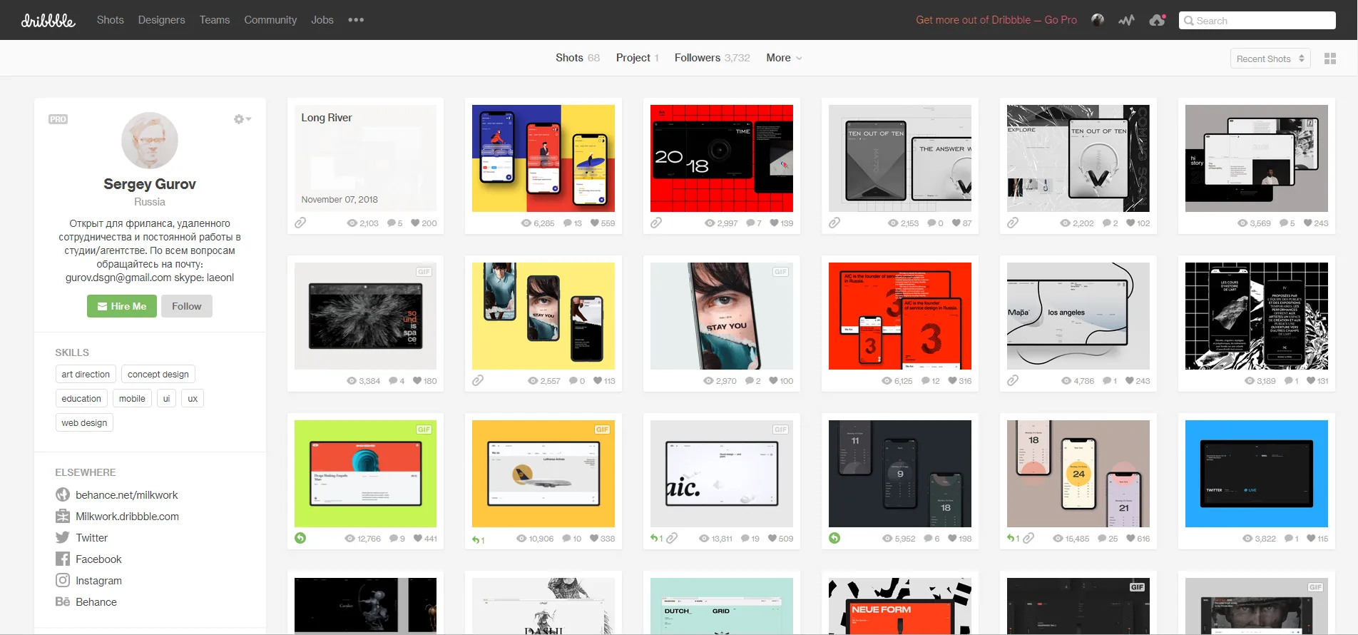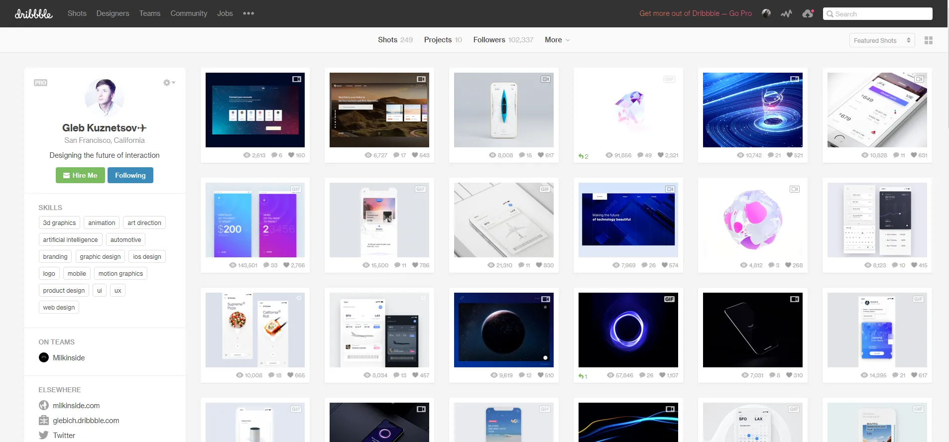 Dribbble в первую очередь — сообщество. Дизайнеры делятся опытом, вдохновляются и ищут идеи. Для обмена мнениями вы можете оценивать работы и подписываться на понравившегося дизайнера. Чем чаще публикуются работы, тем активнее аккаунт и больше просмотров.
