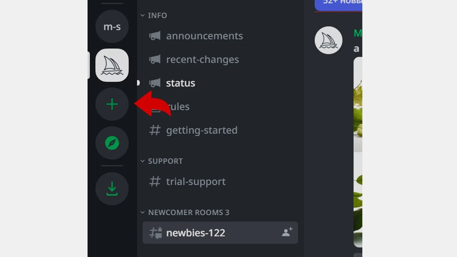 Нажмите на белую иконку с корабликом в левом меню, чтобы перейти в чат Midjourney. В нём вы увидите сообщения разработчиков об обновлениях. Вам же нужно перейти в блок Newcomer Room ― раздел для новых пользователей ― и выбрать в нём чат, название которого начинается с newbies.