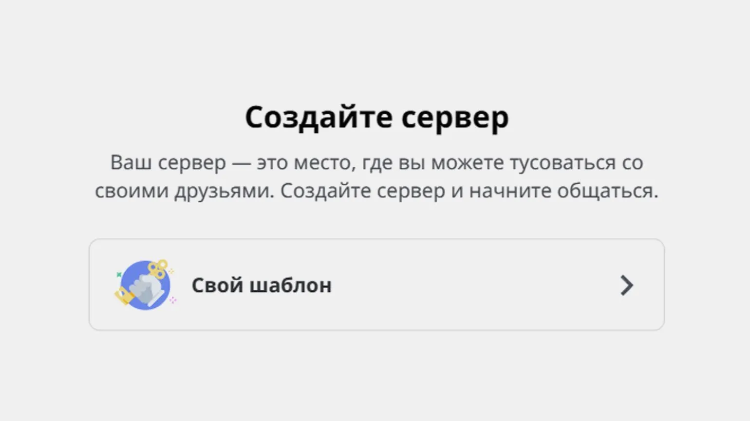 Нажмите на кнопку со знаком «+» на левой панели и создайте свой сервер. В открывшемся окне Create a server выберите «Свой шаблон» (Create My Own) → «Для меня и моих друзей» (For me and my friends). Задайте серверу имя.