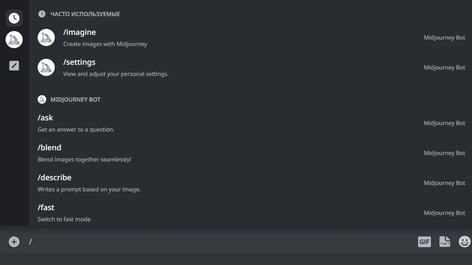 Поскольку Midjourney ― бот, то давать команды нужно при помощи текстовых операторов. Подсказка с ними появляется, если набрать в текстовой строке значок «/», также система сама достраивает слово-оператор по мере набора текста.