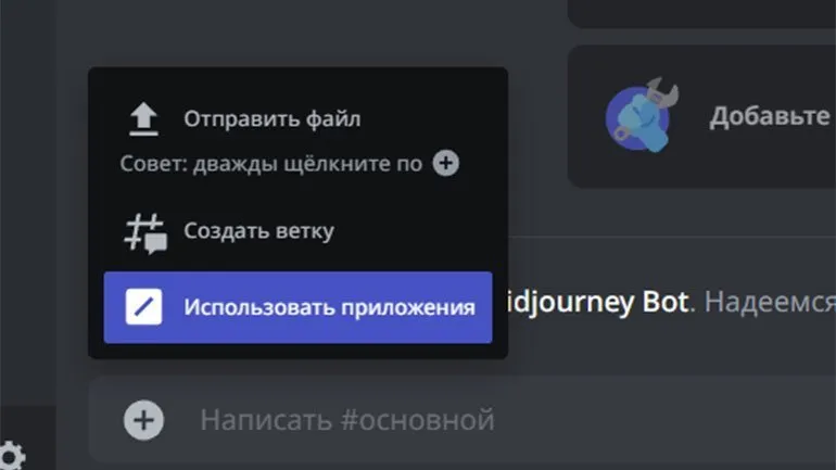 На своём сервере нажмите на значок «+» слева от поля ввода текста внизу экрана и кликните по строчке «Использовать приложения» (Use Apps).