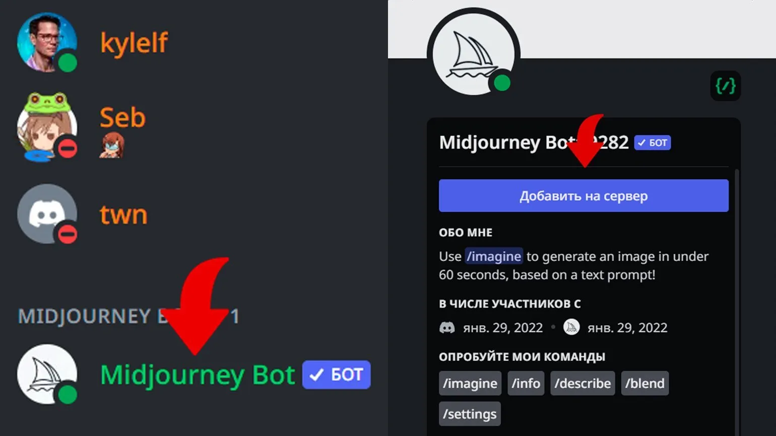 Сначала идут члены команды, а под ними ― подключённый к чату бот: Midjourney Bot. Кликните по названию бота, чтобы добавить его на свой сервер.