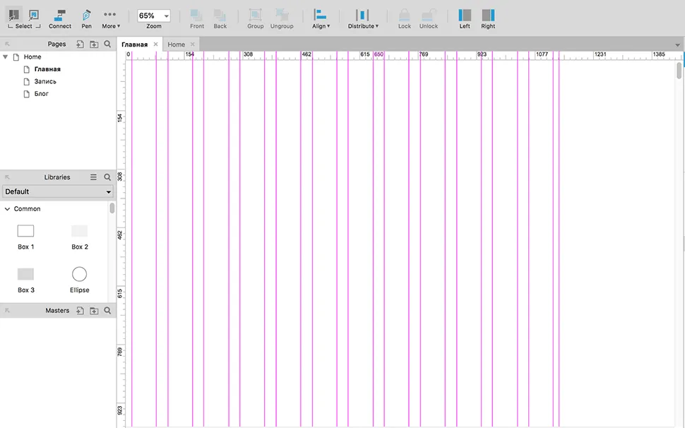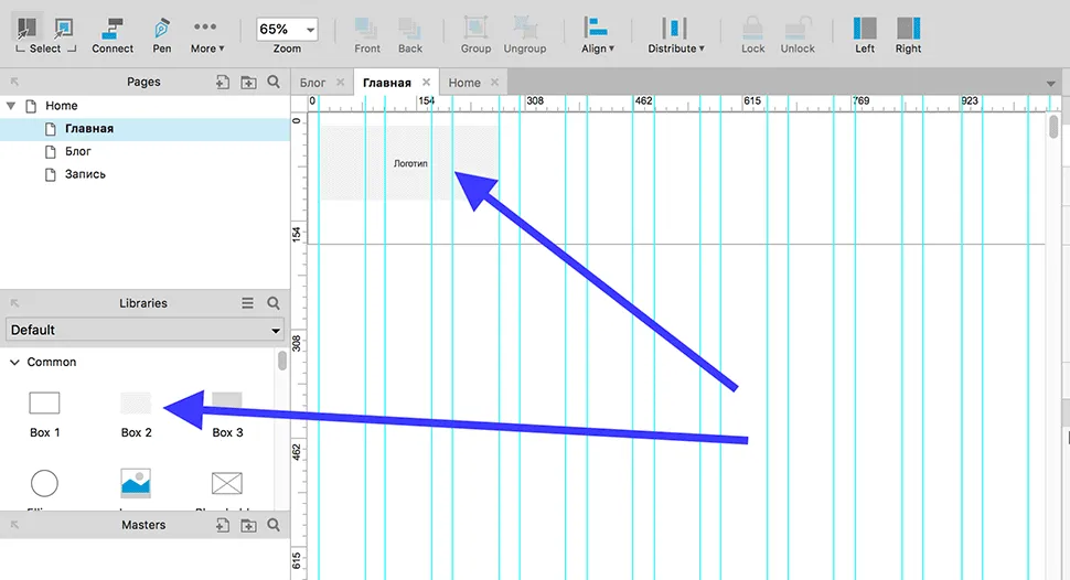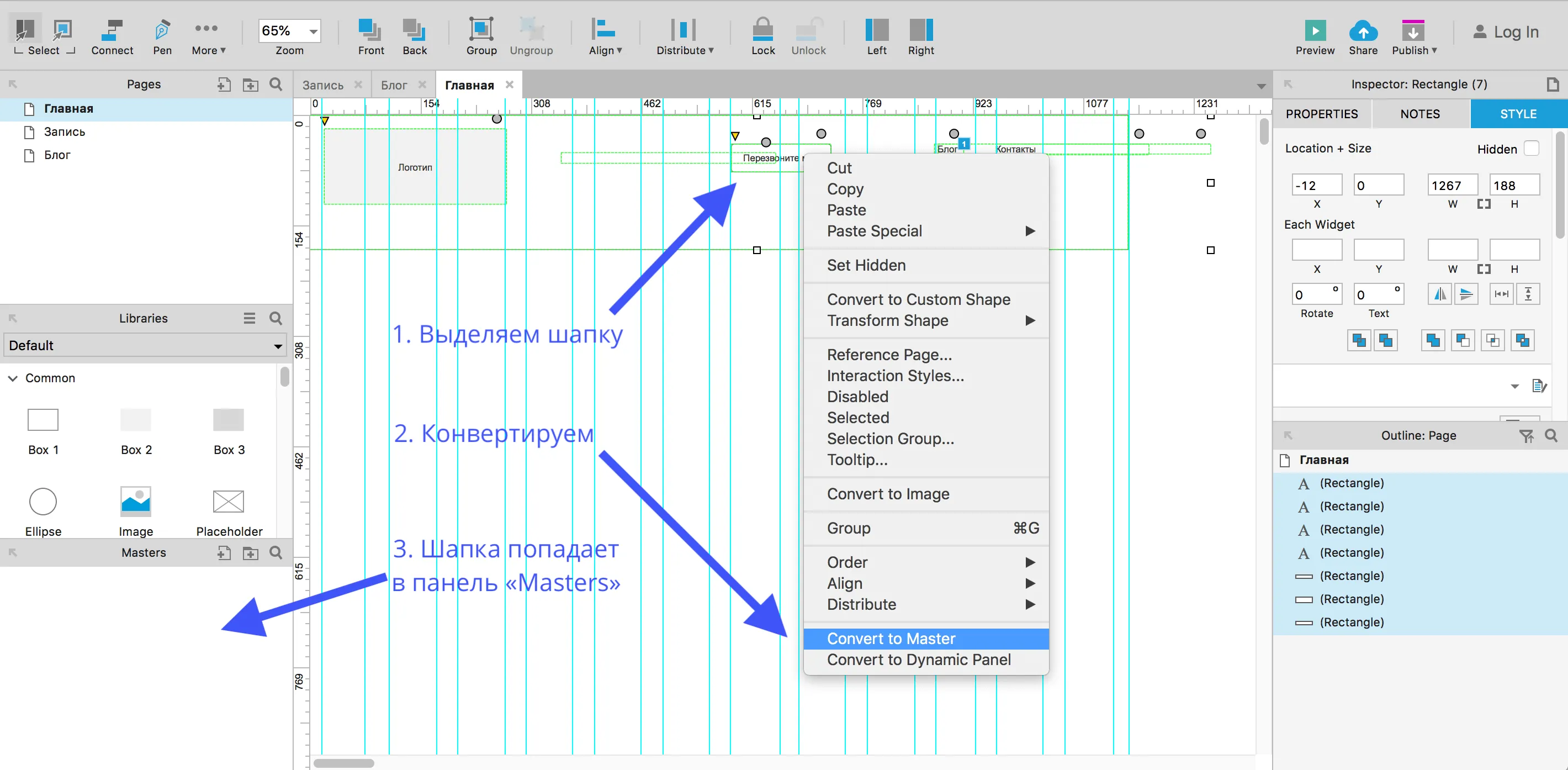 В прототипах с большим количеством страниц пользоваться такой шапкой неудобно. Для каждой новой страницы её нужно будет или рисовать с нуля, или копировать с предыдущей. А если потребуется внести изменения, то придётся редактировать шапку на каждой странице отдельно. Чтобы избежать этого, проектировщики используют панель Masters в правом нижнем углу.