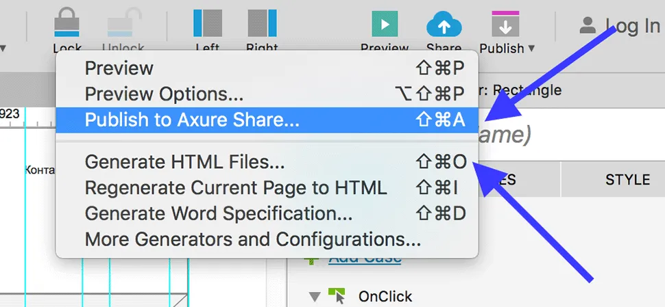 Нажимаем кнопку Publish в правом верхнем углу и выбираем Publish to Axure Share, если нужно опубликовать прототип, или Generate HTML Files, если нужно скачать его на компьютер.