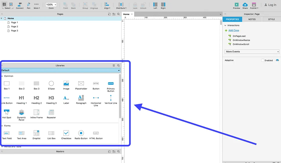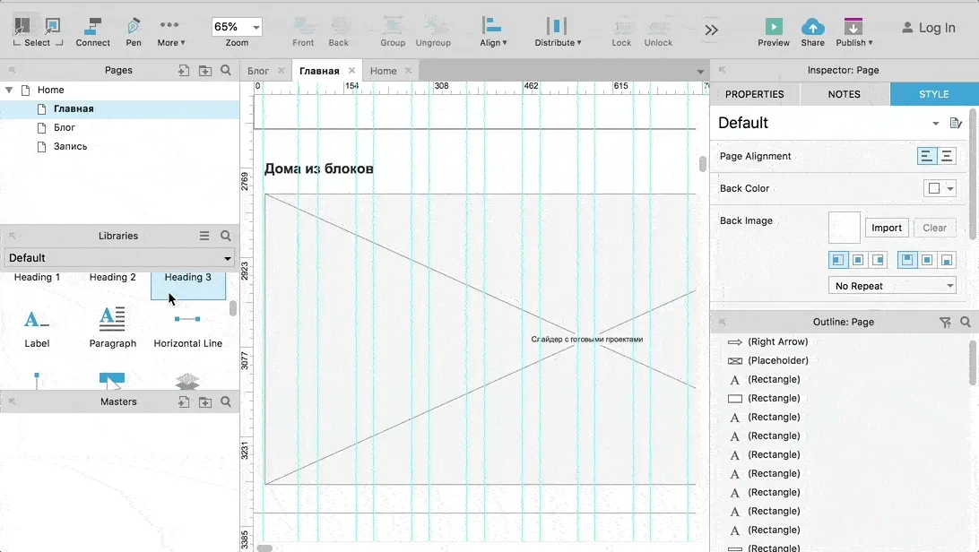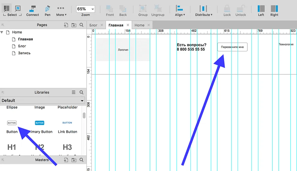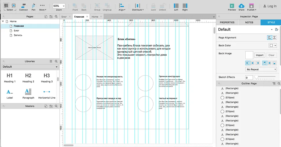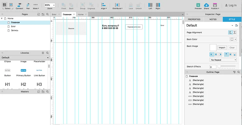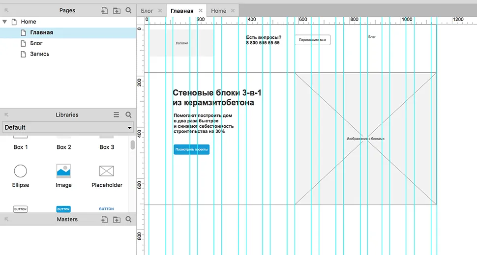 После того как мы задали сетку, переходим к созданию прототипа. Для этого используют элементы из библиотеки (окно Libraries).