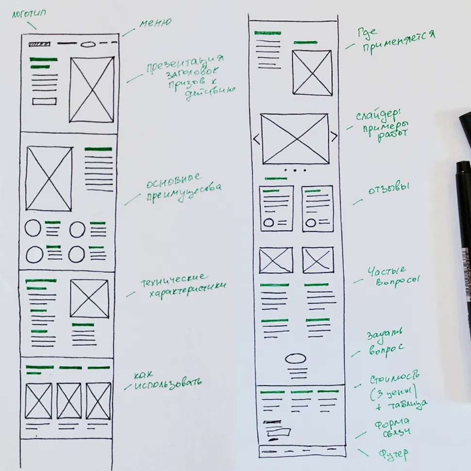 На встрече с заказчиком делают примерный план сайта на бумаге. После этого — конструируют интерактивный прототип и обсуждают возникшие вопросы, исправляют ошибки и неточности. Такой подход позволяет сэкономить время и ресурсы.