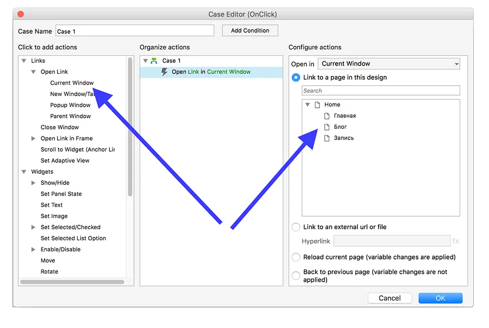 Для этого выбираем Open Link («Открывать ссылку») → Current Window («В текущем окне») → Блог (какую страницу открывать). Весь процесс настройки: