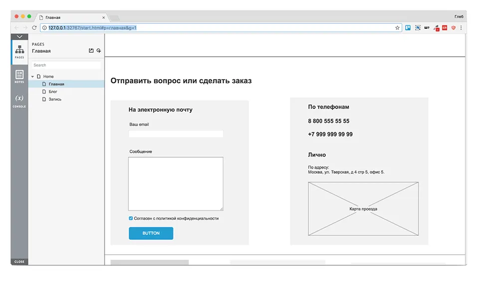 Готовый прототип можно сразу открыть в браузере, поделиться через серверы Axure или экспортировать как HTML.