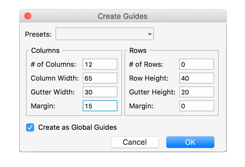Чтобы сэкономить время и не задавать вручную все направляющие для макета, создадим их автоматически: выбираем пункт меню Arrange → Grid and Guides → Create Guides. В появившемся окне задаём размеры.