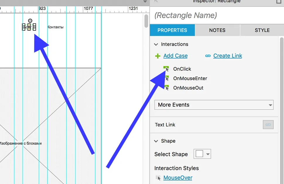 В Axure любой элемент прототипа может быть триггером для действий, так мы присвоим объекту определённую логику поведения. Это помогает смоделировать работу сайта.