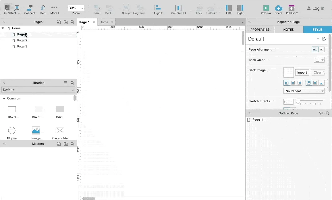 Создаём новый проект: File → New. По умолчанию Axure откроет новый проект с тремя пустыми страницами. Переименуем их под структуру будущего сайта.