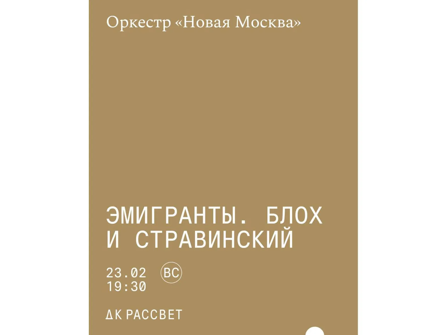 Оркестр Новая Москва представляет программу, посвящённую музыке Игоря Стравинского и Эрнеста Блоха. Оба композитора оказались в США эмиграции, и у обоих были неоклассические сочинения в трёхчастной барочной форме concerto grosso (быстро — медленно — быстро), от которых были и до сих пор в восторге молодые музыканты.