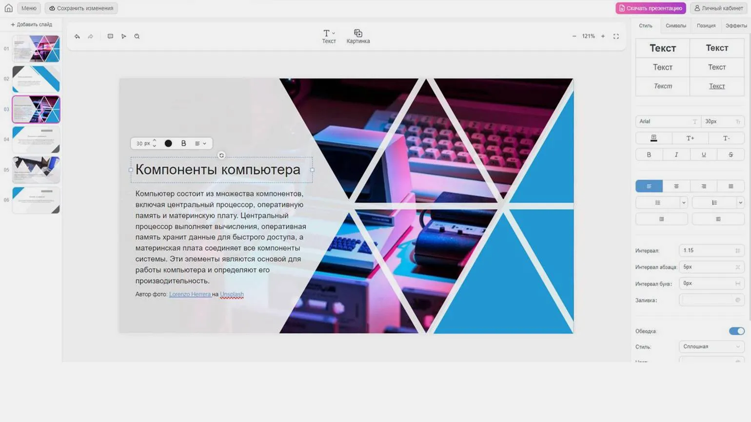 Возможности. Для начала работы нужно ввести промпт с темой и указать количество слайдов. Затем вам предложат поправить сгенерированный текст и выбрать шаблон, в котором он будет свёрстан. Результат можно скачать в формате PPTX и редактировать уже на компьютере — с помощью PowerPoint или другого редактора презентаций.