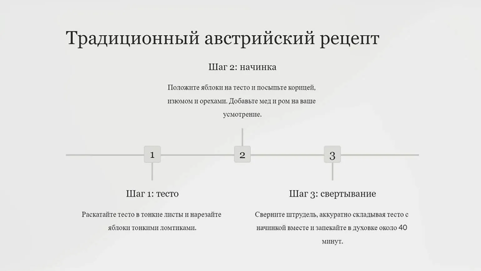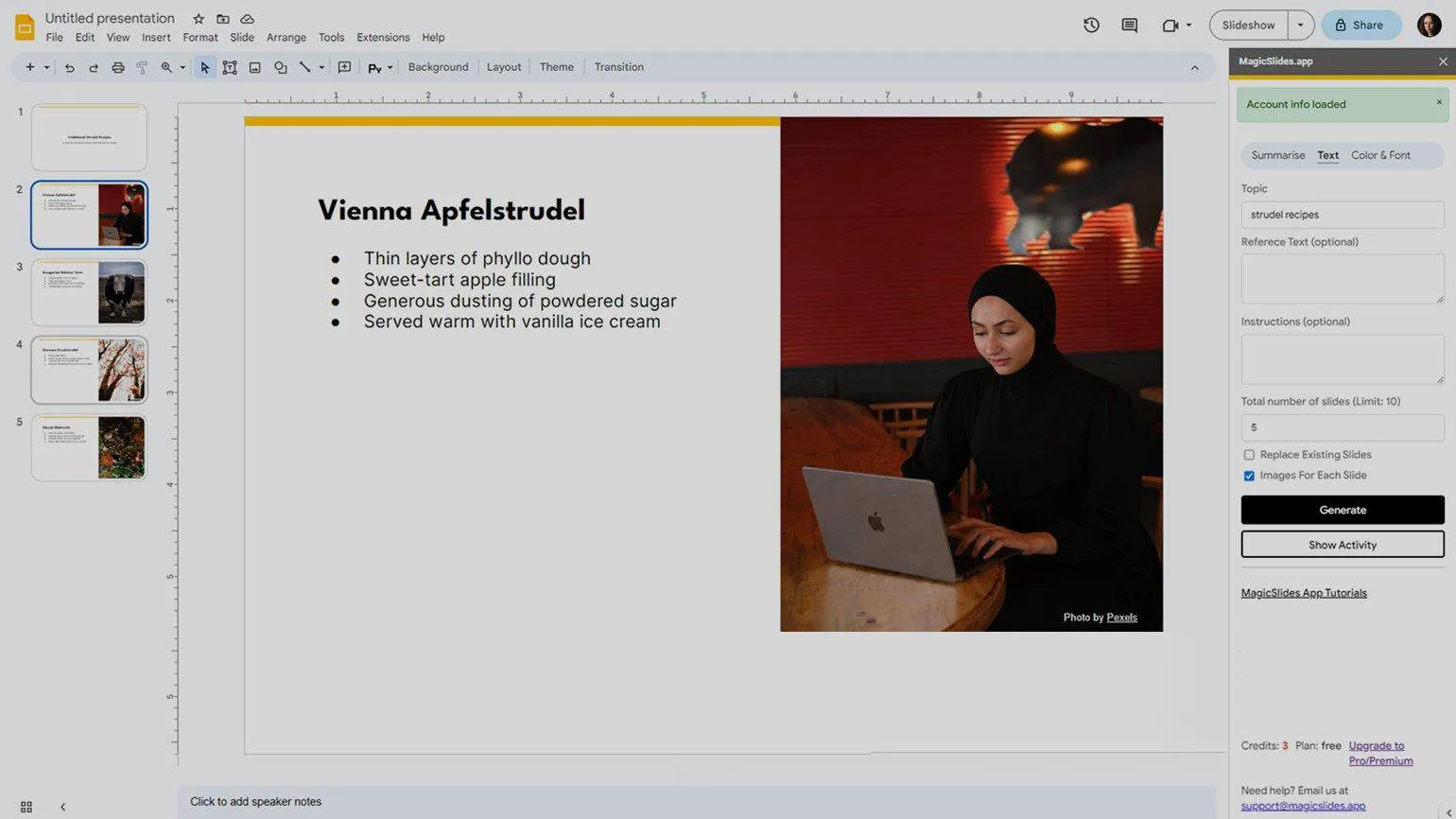 Недостатки. Формально плагин поддерживает все языки, но при попытке сгенерировать текст на русском зависает. Иногда неточно подбирает иллюстрации: например, к слайду про венский штрудель нам выдал фото мусульманки с макбуком.