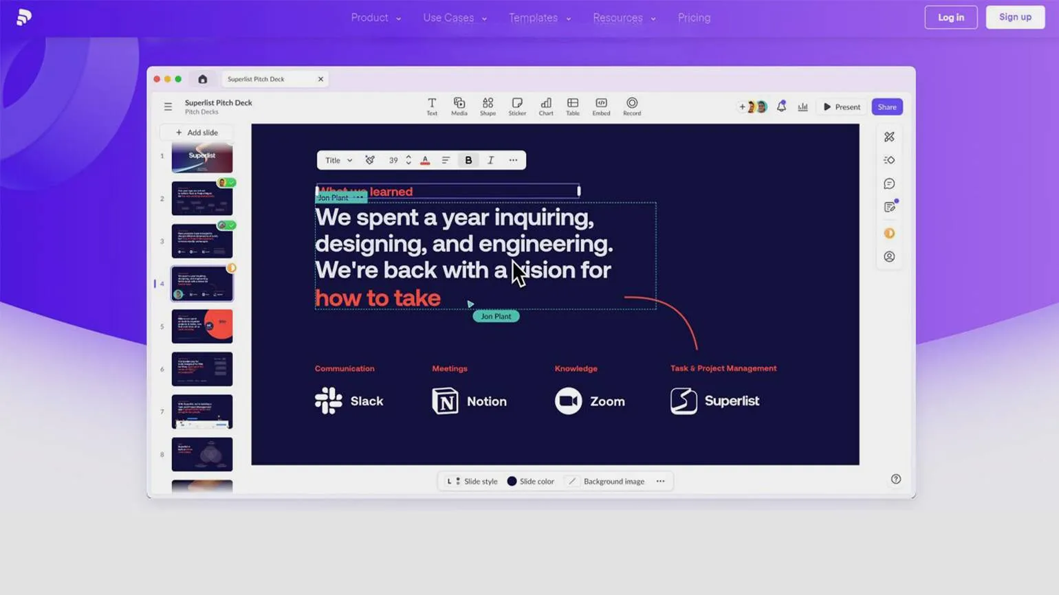 Возможности. Этот сервис сделало агентство Slidebean для стартаперов. Редактор похож на PowerPoint или Google Slides: можно брать готовые шаблоны или делать презентацию с нуля, писать текст и добавлять иллюстрацию. Нейросеть здесь помогает только с вёрсткой: можно попросить его сделать редизайн конкретного слайда или всей презентации. Полезно, чтобы посмотреть, как можно по-разному оформить один и тот же слайд.