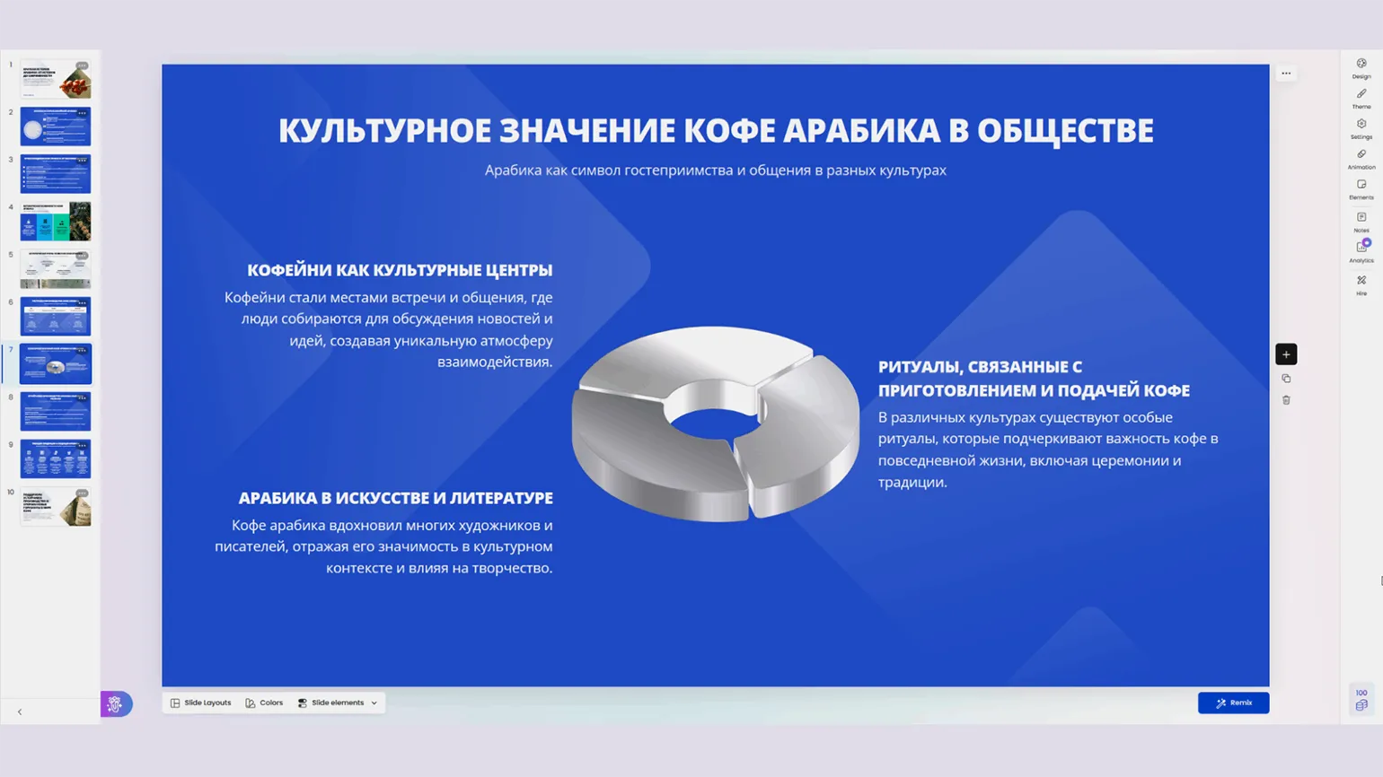 Недостатки. Нейросеть стремится сделать так, чтобы результат выглядел корпоративно — например, мы попросили её сделать «краткую историю арабики», и в слайдах сервис применил странные шаблоны с таблицами, графиками и диаграммами. На одном слайде может оказаться слишком много текста и иконок. Экспорт доступен только по подписке.